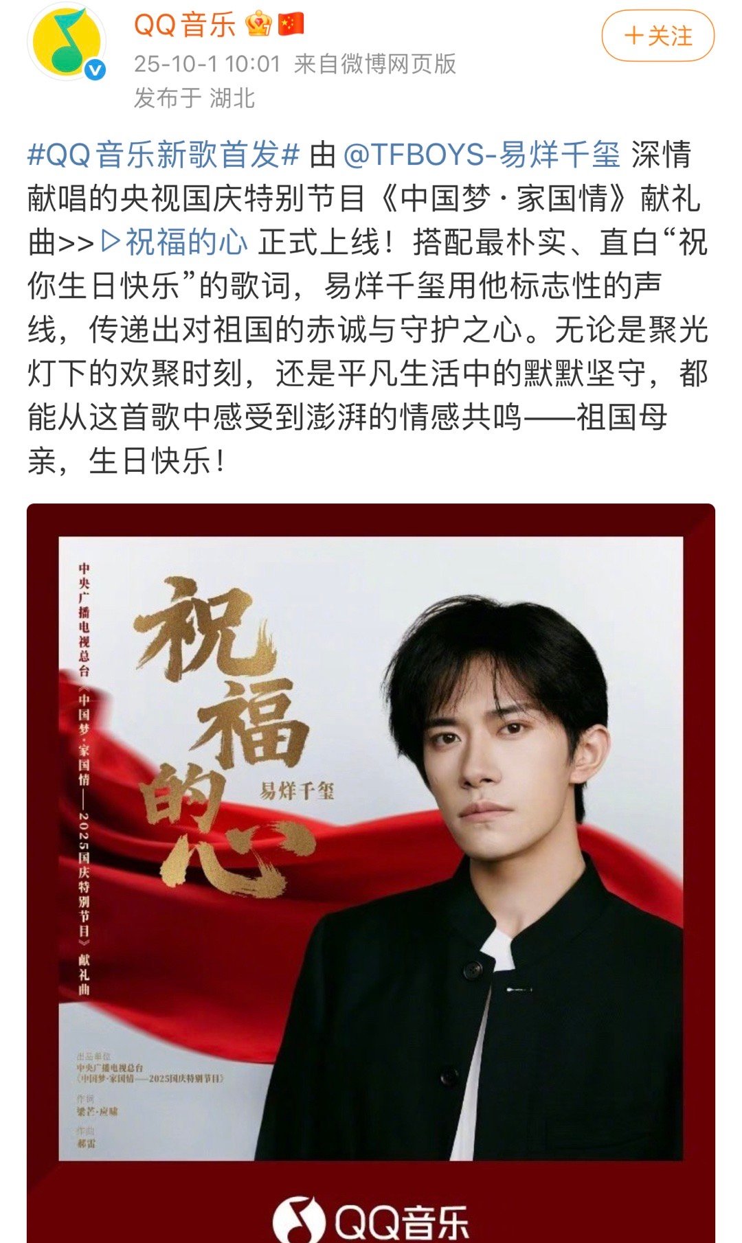 易烊千玺央视国庆献礼曲新歌祝福的心,官方认可的正能量明星[666]