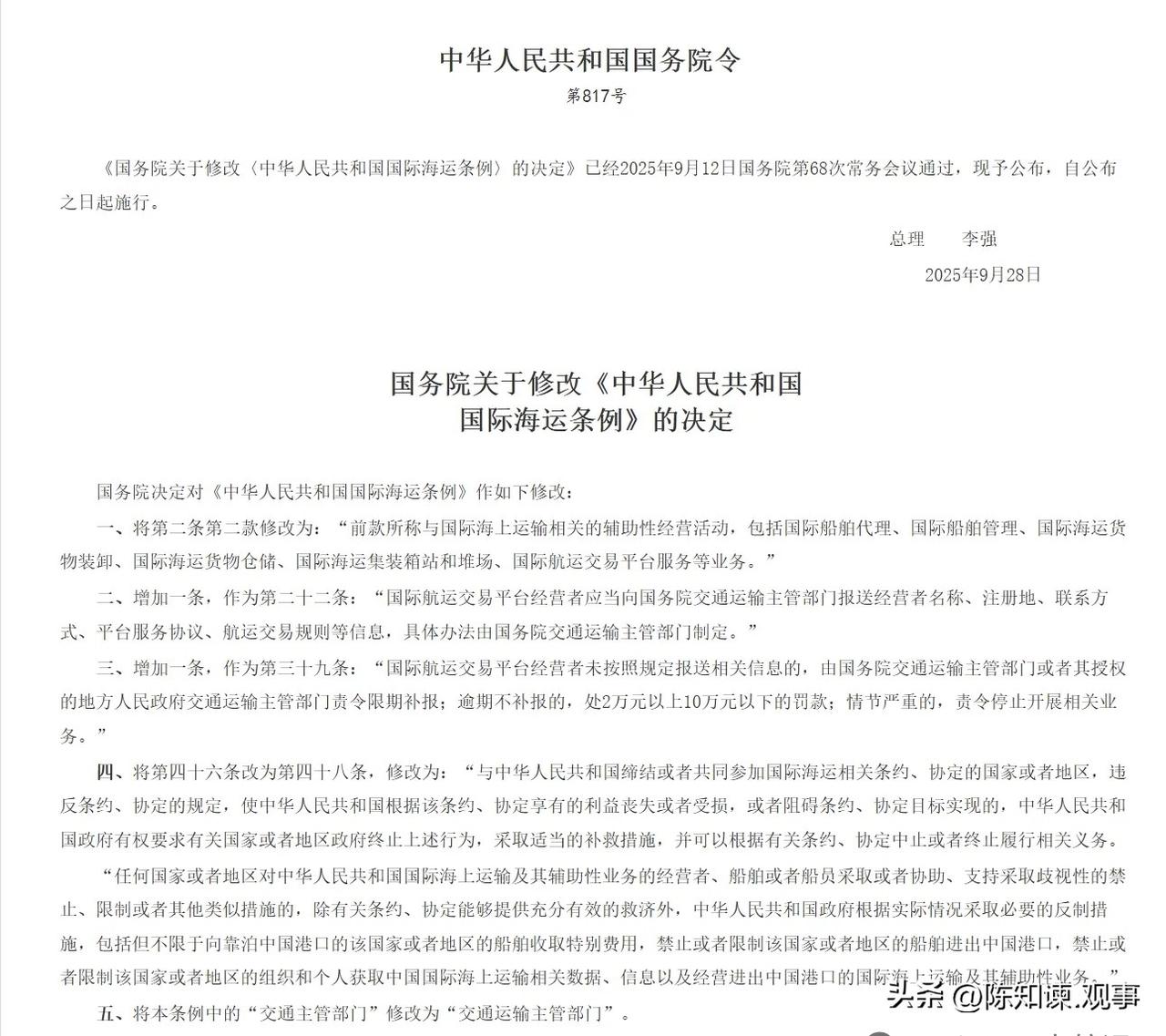 美对华船舶加费政策将生效,航运业懵了? 因为政策到现在还没出来细节!! 这下可太有好戏看了。 美国针对中国建造船只的额外港口费政策,10月14日就要生效了,但现在还没说清具体咋执行,不少美国航运人吐槽“一头雾水”。 不过这事影响不小。 中国造船业占全球大半份额,全球近九成商船都可能被波及。目前美西线40呎柜运价已跌到1400美元左右,逼近成本线,加费后美国消费者买进口商品得花更多钱。 当然我们可早有回应。 商务部明确反对这一做法,称会采取必要措施维权。 中方反制措施可能针对的是美国船舶,包括悬挂美国国旗或由美国公司所有的船只,尤其是美国美森轮船有限公司。 美森轮船(Matson Navigation Company)是一家成立于1882年的美国公司,总部位于夏威夷的檀香山。是历史上第一家提供泛太平洋集装箱班轮服务的公司。 公司长期经营的跨太平洋航线,包括从中国至美国南加州的航运服务。相关数据显示,美森在全球集装箱承运商中排名第29位,占全球运力的0.2%。 另外,中远海运等企业已表态,会优化运费政策、维持航线运力,不打乱对美贸易运输。 有消息说,中国港口可能对相关船舶调整停靠优先级,联动“一带一路”港口应对。 目前,美国国内港口、零售行业本就反对,觉得会推高成本。 而且中国船舶性价比高,船东不会轻易放弃。更可能的是,航运企业通过调整航线分摊成本,美国想借这招打压中国造船业,最后恐怕是“搬起石头砸自己的脚”,反倒让全球供应链更乱。