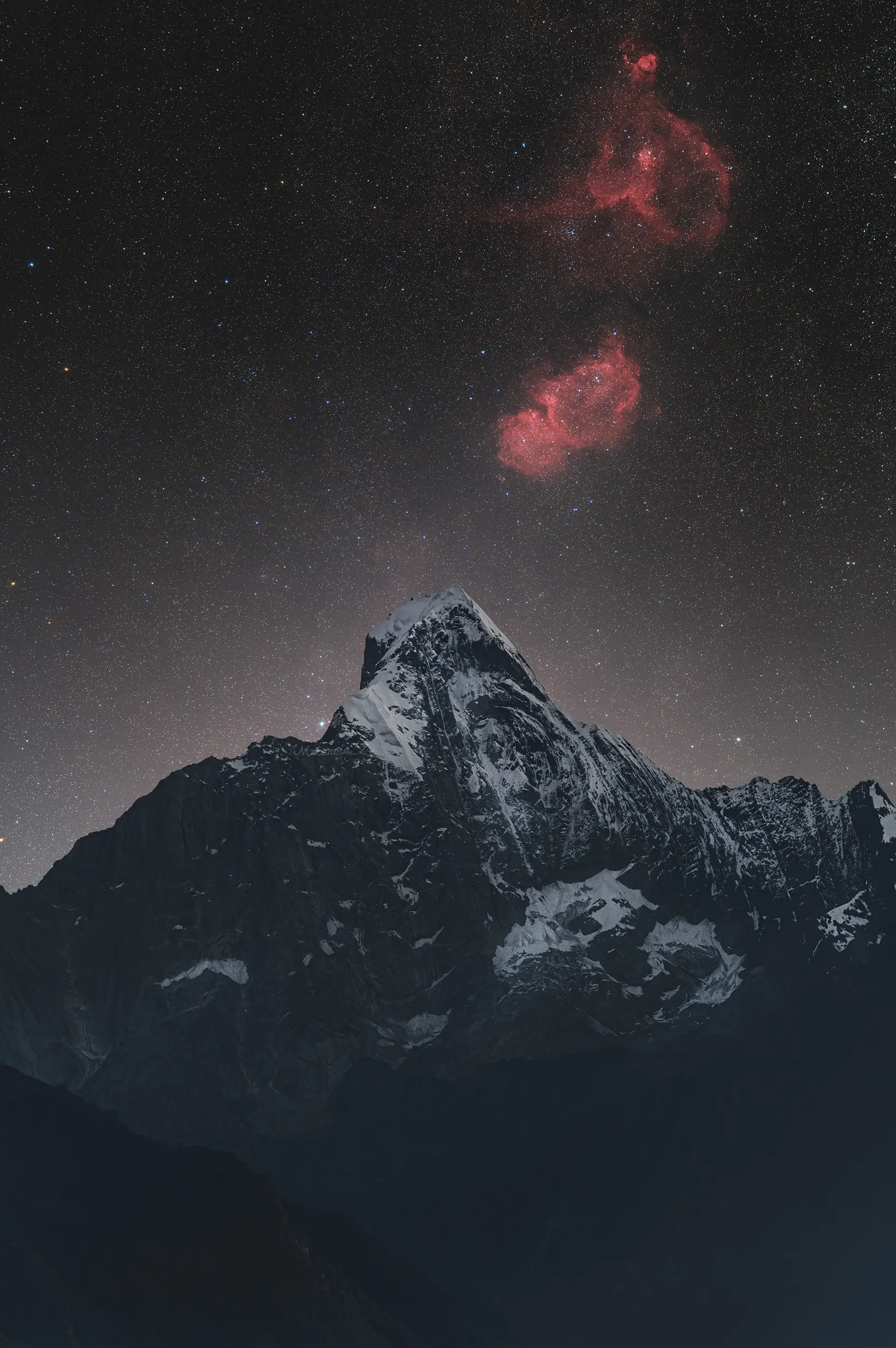 幺妹峰与灵魂心脏星云。山与星空对峙了千万年,一个用岩石铭记永恒,一个用光芒诉说遥远。