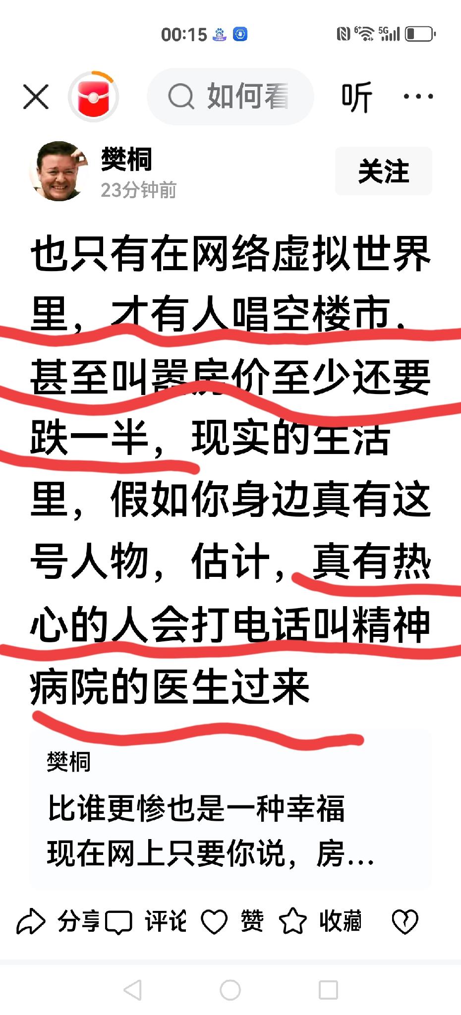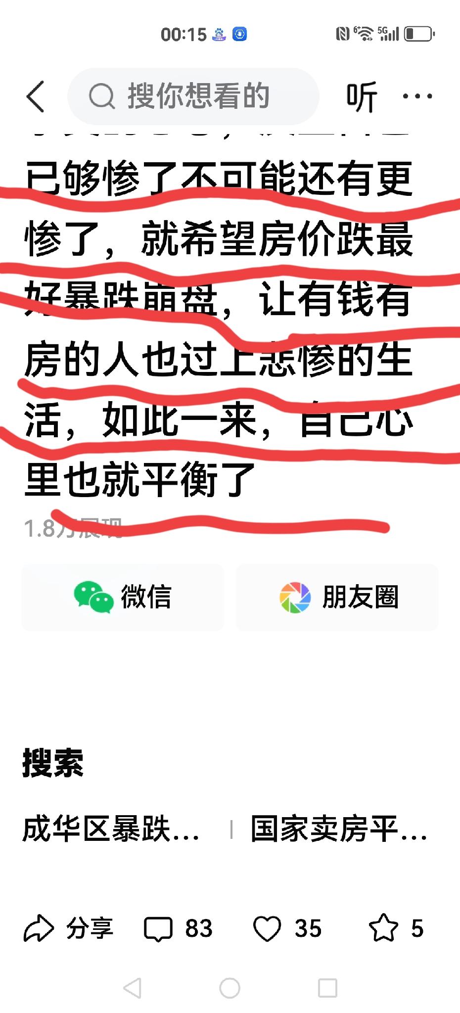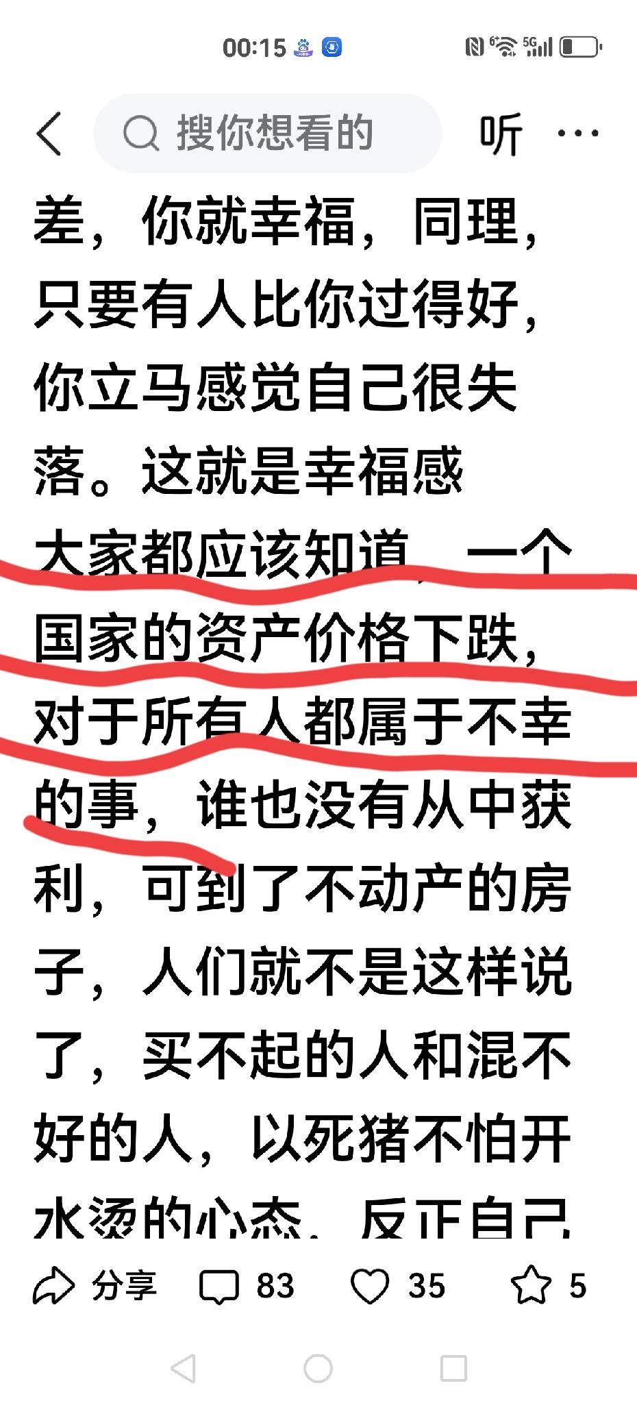 【这说得是北哥吗?】 比谁更惨也是一种幸福 两派: 多套住房的人与开发商,另一派是买不起房与仅有一套住房。 一个国家的资产价格下跌,对于所有的人来说都是悲剧。 为了保持平衡,很多人希望房价暴跌,跌到有钱人纷纷离开,这是什么意思?