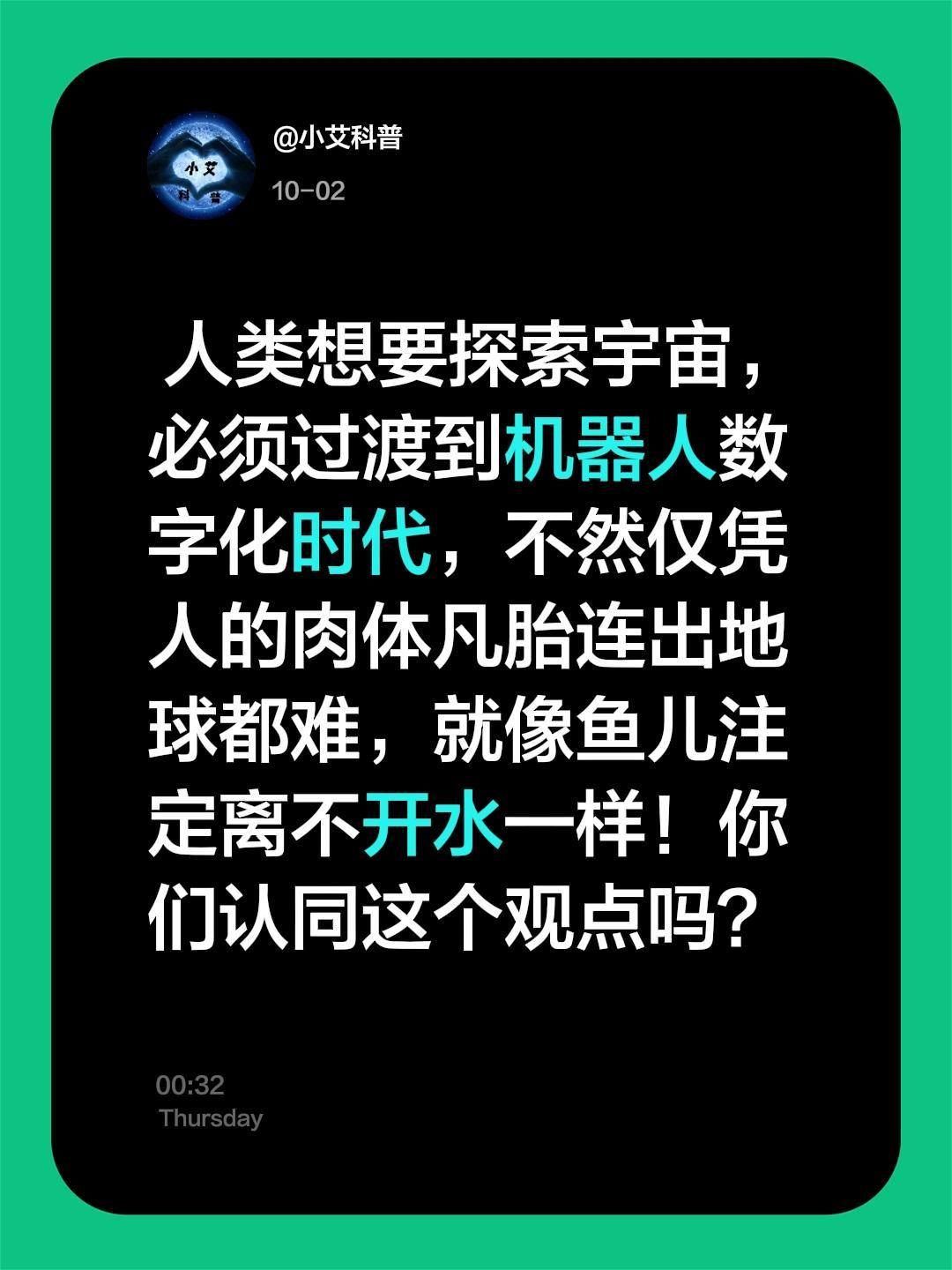 人类想要探索宇宙,必须过渡到机器人数字化时代,不然仅凭人的肉体凡胎连出地球都难,就像鱼儿注定离不开水一样!你们认同这个观点吗?