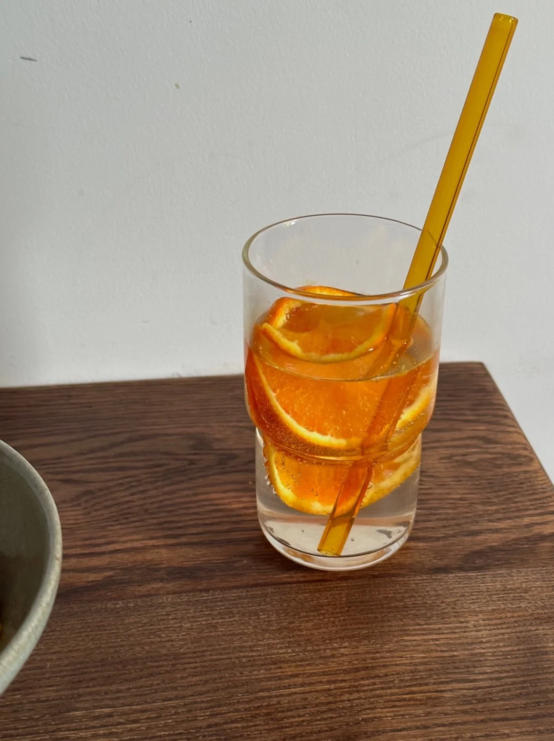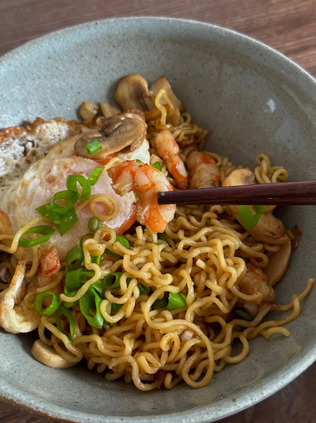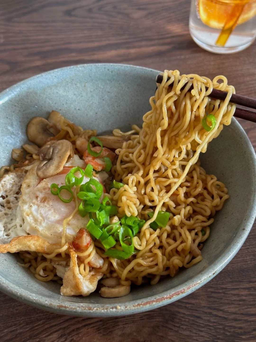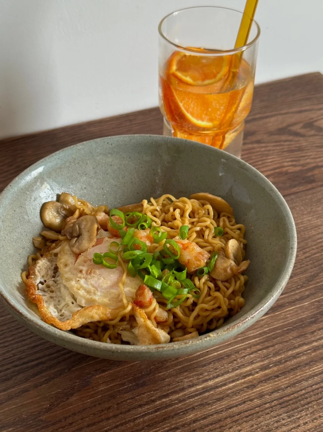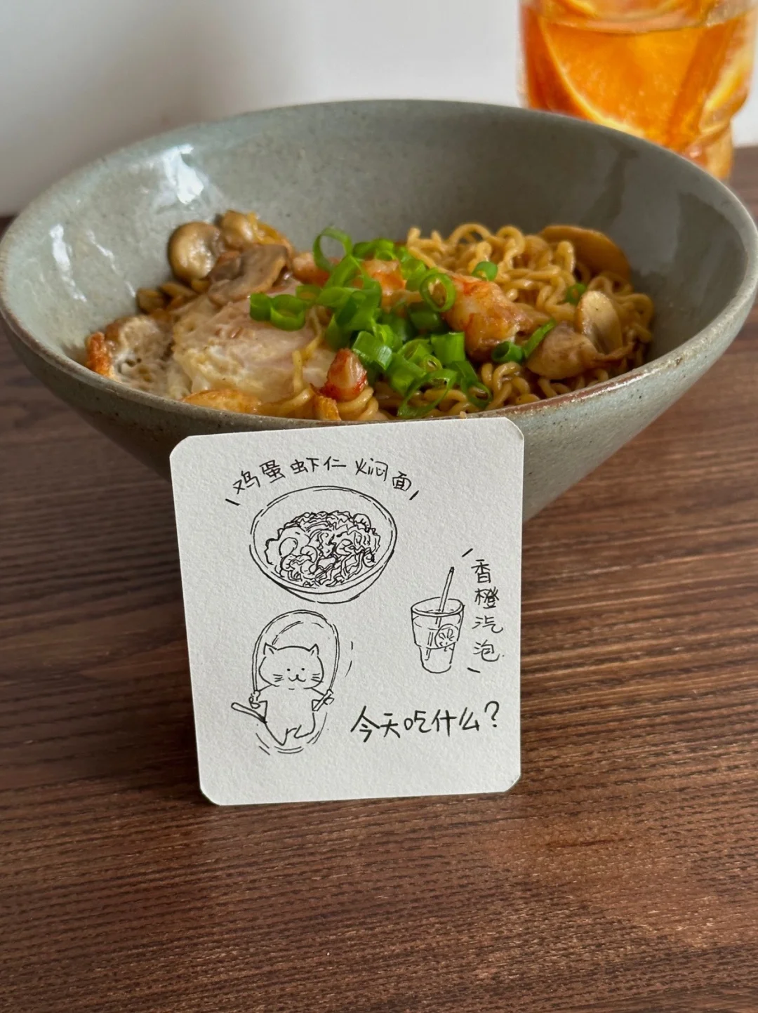 今日午餐:鸡蛋蘑菇虾仁焖面,香橙气泡