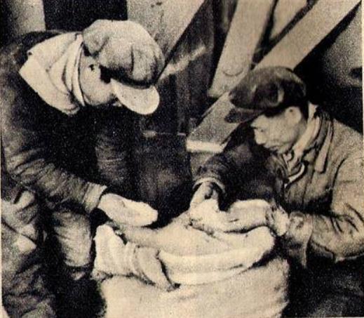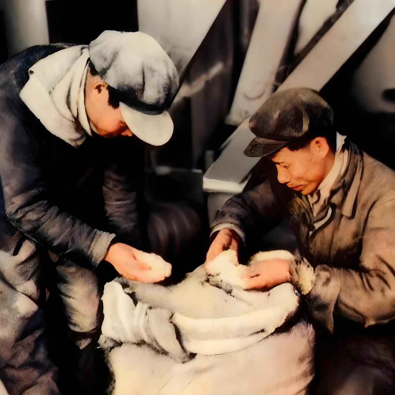 1952年,三反运动中,两位身着厚实工装、头戴帽子的人员正专注地围绕一袋物料操作。皖北救灾委员会调查发现,商丘的私营商粉厂存在坑害灾民的行为,其中一家就坑骗了十八万一千斤麦;据统计,商丘各地私营商粉厂在救济皖北及山东省灾民的粮食里,通过掺粮、使水、加灰等手段牟取的暴利,竟达十亿元左右。
