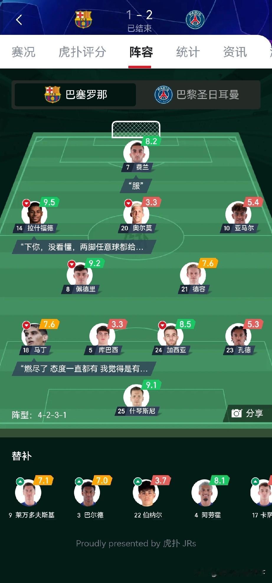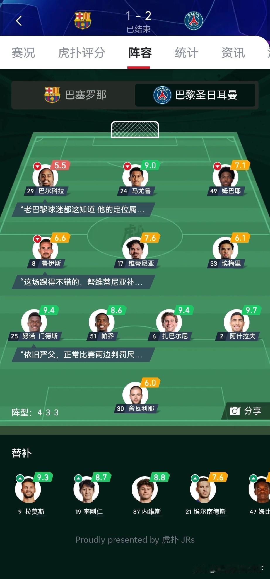 弗里克下课吧,主场连残阵巴黎都踢不过,佩德里一下场,巴萨球都拿不住了,真是丢人现眼。 这场巴黎的登贝莱、K77、杜埃三叉戟一个都不在,巴萨最后二十分钟几乎很难过半场,而且还是在自家主场都踢的这么被动,脸都不要了。 感觉巴萨跟巴黎的实力还是有点大,尤其是后防线感觉差了两三档。巴萨这条防线还是不够对抗欧冠四强以上的攻击线。 只能说这场巴萨的体能被巴黎一群体力怪给拉爆了。巴黎这俩边后卫90分钟冲刺都不带减速的。 世界未解之谜:车子是怎么干完全体大巴黎3:0的?难道就是因为帕乔没上?