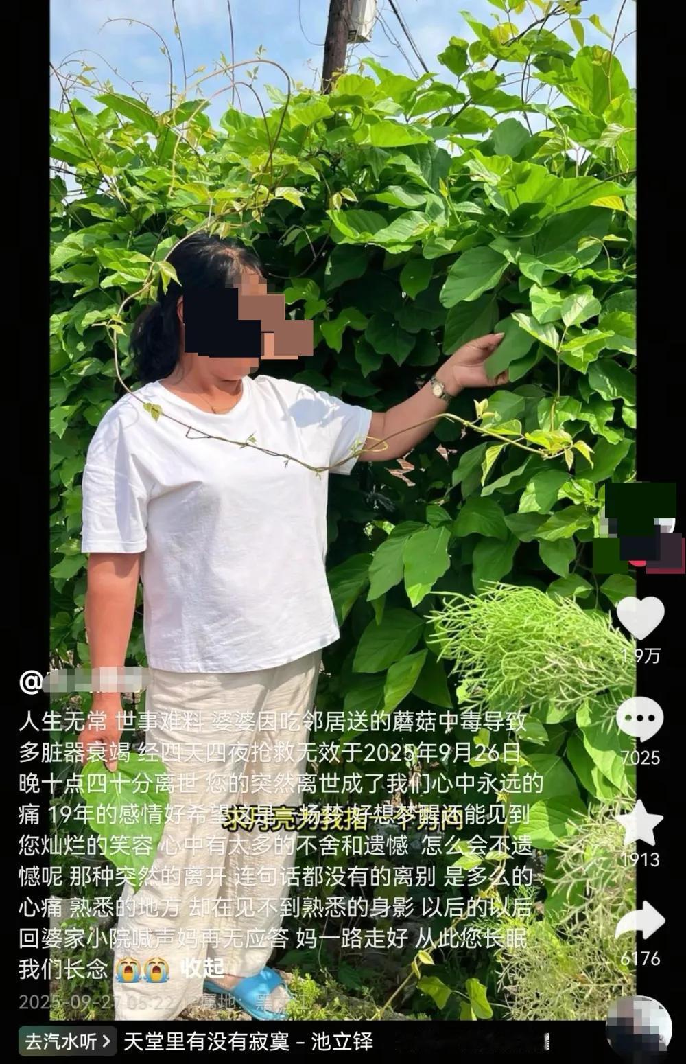 “痛惜!”黑龙江,一村民看邻居大妈天天出去干活,没空上山采蘑菇,就把自家蘑菇给了她一些,没想到大妈恰好吃到了混在里面的少量毒蘑菇,在医院抢救了4天去世了,这让邻居后悔不已,网友:自己采的蘑菇也想送给别人,忽然也是想到这个问题,最终没有送出去! 九月的黑龙江林区,清晨的露水还凝在蘑菇伞盖上,空气里飘着松针和泥土的混合气息。 齐齐哈尔市龙江县白山镇的李大哥背着竹筐下山时,特意绕到了邻居张大妈家的玉米地边。 这阵子张大妈天天天不亮就来晒玉米,腰弯得像张弓,根本没空上山采这季节最鲜的蘑菇。 嫂子,我刚采的,你拿回去炒个鸡蛋,补补身子。 李大哥把竹筐里的蘑菇往张大妈手里的塑料袋里倒,带着泥土的菌柄还沾着草叶,白胖的菌盖看着就招人喜欢。 可谁也没料到,这份带着烟火气的馈赠,会变成夺走生命的利刃。 当天傍晚,张大妈把蘑菇洗干净炒了一盘,自己吃了大半。夜里两点多,她突然捂着肚子疼得直打滚,冷汗把被褥都浸湿了, 呕吐物里还带着没消化的蘑菇残渣。 家人慌了神,连夜把她送进县医院,刚到急诊就被下了病危通知,直接推进了重症监护室。 医生说毒素已经顺着血液往肝里钻了,人全身发黑,连尿都成了茶色。 张大妈的儿媳,就是常发家庭日常的博主“白山静静”,在后来的视频里说起这些时声音还发颤。 从9月22日送蘑菇到26日晚上十点四十分,四天四夜的抢救,ICU的费用像流水一样花出去,可最终还是没能留住张大妈的命。 李大哥守在医院走廊里,手里攥着没送完的半筐蘑菇,反复摩挲着菌盖,眼泪砸在冰冷的地面上,我要是多挑一遍,要是提醒她仔细看看,咋会出这事啊! 村民们说,这季节采蘑菇是当地人的习惯,大伙儿都是一桶一桶地往家拎,邻里间互相送点山货再平常不过。 张大妈和李大哥家更是好得能串着门吃饭,之前李大哥送过好几次蘑菇,从来没出过岔子。 谁能想到,就那两个混在里面的毒蘑菇,偏偏要了人的命。 “白山静静”把账号里和婆婆合拍的视频全下架了,那些帮婆婆梳头、买新衣的温暖画面,现在成了全家的催泪弹。 她丈夫看一次哭一次,公公直接病倒在床,整个家的重担都压在了她一个人肩上。 面对网友“邻居肯定跑不了责任”的评论,她只淡淡地回了句,人家是好心,我们不追究。 这场悲剧不仅让两个家庭心碎,也让大家跟着犯嘀咕:好心送东西,出了事到底要不要担责?毒蘑菇为啥这么厉害? 李大哥送蘑菇的行为算“好意施惠”,就是邻里间的善意帮忙,一般不会负刑事责任。 但《民法典》里也说了,要是没尽到注意义务,比如明知道可能混毒菇却没提醒,就可能要承担民事赔偿。 不过就像这事儿里,李大哥自己也不知道混了毒菇,家属又不追究,法律也不会强制追责。 这场用生命换来的教训,其实在提醒每一个人:邻里互助的温情很珍贵,但这份善意得有安全兜底。 就像网友说的,自己采的蘑菇想送人时,多想想可能的风险,哪怕只是“小心为上”的一句提醒,也比“好心办坏事”的遗憾强得多。 毕竟,真正的善意,从来都不是盲目分享,而是把安全放在第一位的体谅。 信息来源:羊场晚报2025-09-29发布:网红发文悼念婆婆:吃了邻居送的蘑菇中毒,抢救四天四夜死亡!这些蘑菇避毒原则可能是陷阱