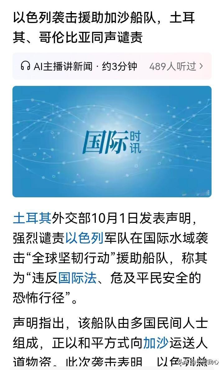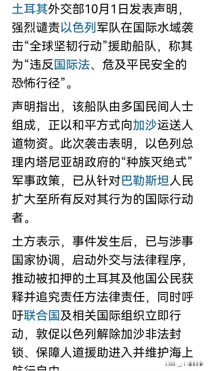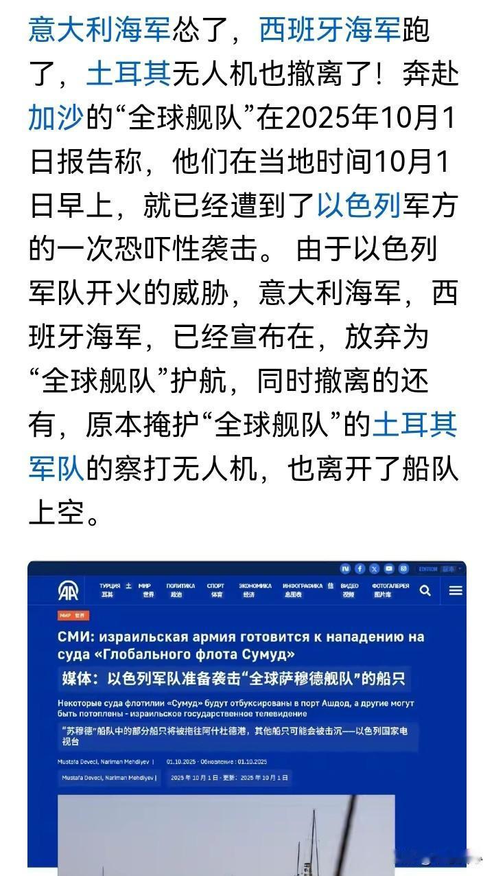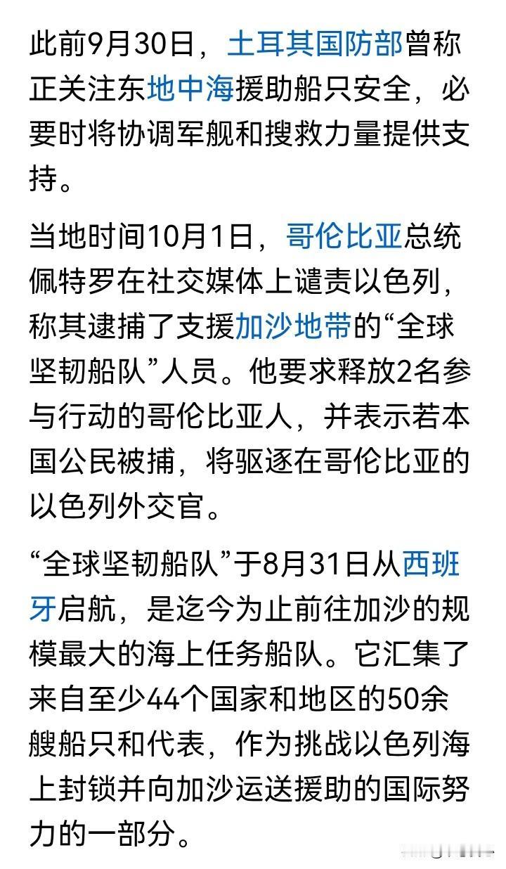 反正已经罪恶滔天,不在乎多一桩罪行!不出意料,以色列军队拦截了要支援加沙人民的“全球坚韧”船队。 “全球坚韧”船队的船只数量达到50多艘,船上来自世界各国的500多人,其中包括各国议员、律师和瑞典“环保少女”格蕾塔·通贝里,而船上装载的是支援加沙巴勒斯坦人民的人道主义物资,意在打破以色列对加沙封锁。 此前,意大利、西班牙都派出军舰护航,土耳其则派出无人机巡航。 可是,在以色列海军威胁开火的情况下,意大利海军怂了,最先撤离,西班牙海军也跑了,原本掩护“全球坚韧”船队的土耳其军队察打无人机,也离开了船队上空。 昨天,2025年10月1日,以色列外交部发表声明说,以海军当晚在地中海拦截并登上多艘试图突破以色列对加沙地带海上封锁的船只。以色列媒体报道,对方正是向加沙地带运送人道主义物资的“全球坚韧”船队”。 目前,土耳其、哥伦比亚都对以色列袭击人道主义船队进行谴责。 只是,对于这样的口头讨伐,以色列早就司空见惯。本就已经罪恶滔天,又何惧多一桩罪行? 国家间的官方渠道,包括联合国都无法解决加沙人道主义危机,本来想着依仗几十艘来自世界各国的民间船只突破封锁,如今也告失败。 难道这只能无限期地拖延下去,成了一个无解难题?