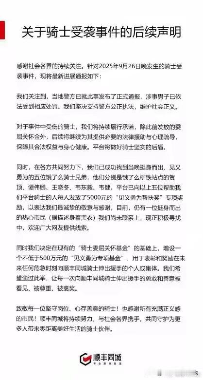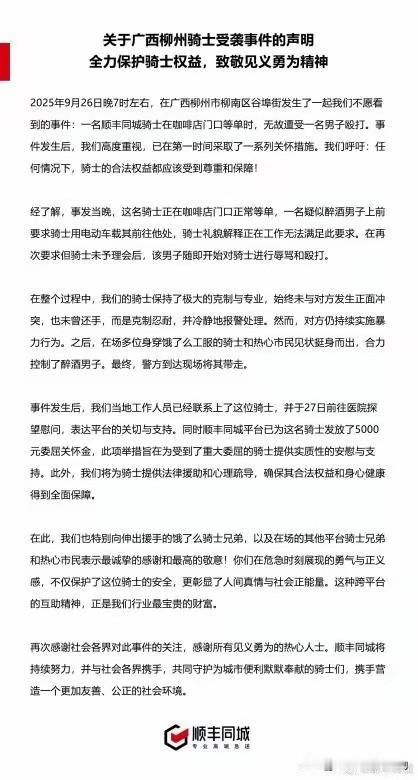 不知从何时起,挨打不能还手,挨骂不能还口,否则你就是互殴,这成了很多国人认为对理所当然的事。这让我想起了十年前的一部老电影战狼2️⃣的海报,“犯我中华者虽远必诛”。当年在影院看到这部电影,内心很燃烧。也是当时第一部票房突破50亿的电影,让吴京一夜封神。可是,口号的背后,当我们受到欺负的时候,我们真的敢反抗吗?当你反抗后,产生的代价你可以承受吗?我想很多人对这个是没有概念的。 就在几天前,柳州一醉酒男子无故殴打了正在等单的顺丰骑手,最后被拘留10天,罚500。而作为东家的顺丰听闻这件事后,给予自家骑手5000元的委屈关怀金,在对帮助自家骑手免于继续承受伤害的饿了么骑手和社会人士表达感谢的同时,还在继续寻找这些有心人,后来也给予公开的点名表扬,和每人发放5000元的“见义勇为帮扶奖”。 这件事,我们要对顺丰竖起大拇指。在对见义勇为的支持上面,阿里和顺丰确实在身体力行。可从小接受“见义勇为”思想的我们,在不是你碰的你为什么要扶的判决下,还有多少人真的敢见义勇为?
