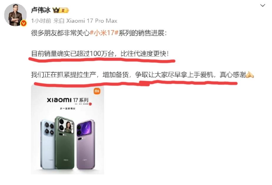 小米总裁卢伟冰官宣:小米17手机销量确实已超过100万台。我们正在抓紧提拉生产,增加备货,争取让大家尽早拿上手爱机…… 虽然短短两句话,但里面透露出来的信息颇多,有网友做出了如下的解读: 1、早前那些阿猫阿狗的博主发出来的首销当天100万台的,现在看来就是一个笑话,实际情况应该是卖了五六天卖出去100万台。至于卢总的这个100万台的销量,大家爱怎么看,就怎么看咯。 2、小米17pro、小米promax确实缺货严重,而小米17应该没有他们预想的这么好卖,所以导致备货的时候三款手机的数量跟实际售卖的偏差有点大,所以卖了没几天就严重缺货了。 …… 大家觉得以上的解读如何?
