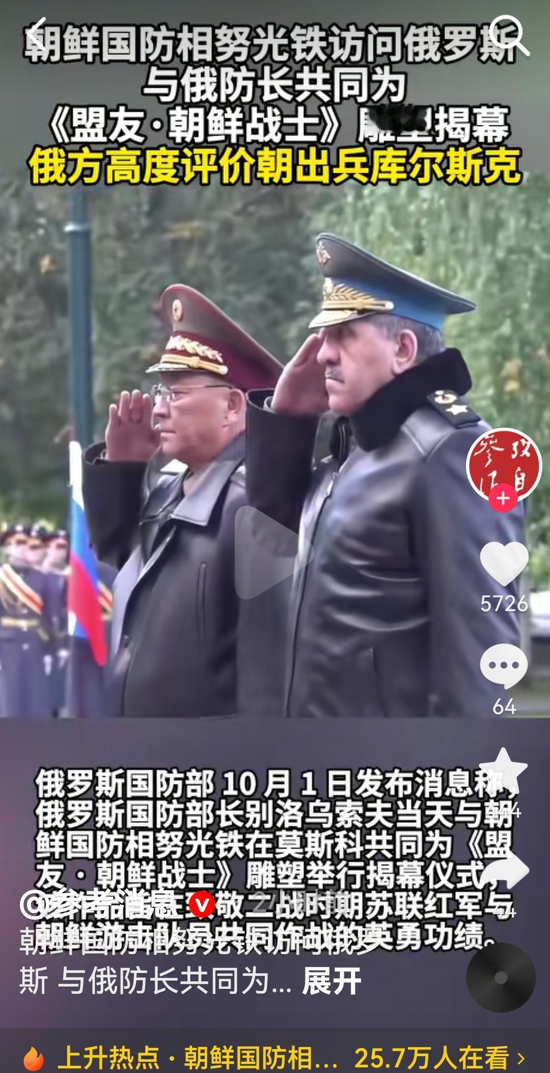 根据俄罗斯国防部消息,10月1日俄罗斯国防部长和朝鲜国防部长努光铁会晤,同时共同出席了《盟友·朝鲜战士》雕塑揭幕仪式 该作品是为了致敬二战时期苏联红军和朝鲜游击队共同作战的英勇功绩 朝鲜国防部长说朝鲜将全力支持俄罗斯的领土安全,国家主权和国家利益的斗争 自从俄乌战争以来,朝鲜可以说给了俄罗斯很大支持既出兵有支持弹药,当然朝鲜也得到了俄罗斯提供能源,粮食,军事技术。最重要的是朝鲜慢慢在国际舞台上活跃起来了,动作也是不断啊 这么多年很少有这么多外交进步朝鲜 朝鲜领导人 图片来自参考消息视频