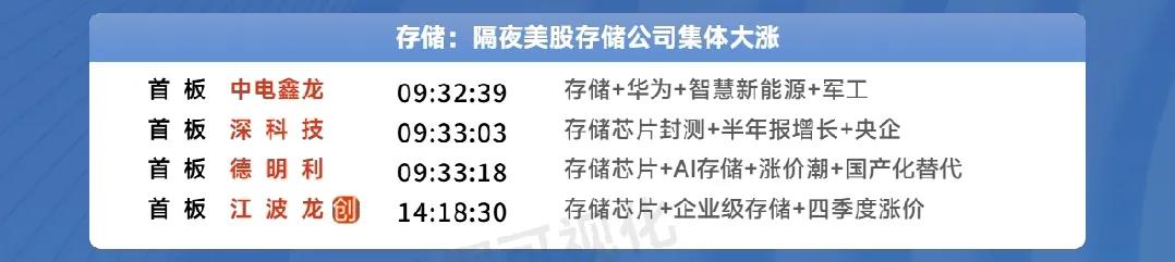 国庆复盘之存储芯片:头部厂商涨价带动的强势行情! 9月最后一个交易日,存储芯片方向走出了非常强势的表现,主要原因是美光科技宣布其存储产品价格上涨20%—30%,在美股存储芯片方向大涨的带动下,A股市场相应方向是有明显跟随的,这也使得整个半导体方向都有跟随走出非常不错的修复走势! 存储芯片这样强势的表现下,从短期趋势上看,是有可能走出持续性的,所以对于这个方向,是节后可以重点关注的方向的,而相应的一些强势个股,就有很大概率走出持续性,国庆小胖根据周五这个方向强势个股的表现,谈谈对于这个方向的整体看法! 1、深科技 深科技是比较有辨识度的存储芯片个股,它在9月24日出现首板涨停后,连续3个交易日是明显的高位洗盘表现,特别是9月29日止跌后稳稳站上25的强支撑位表现都是非常强势的,30日早盘受美股存储芯片大涨的影响,竞价出现超预期的大幅高开抢筹表现,开盘后更是迅速冲高做多拉升,在顶住分歧后,很快迅速封死涨停,而它封死涨停后,全天几乎没有特别大的抛压,走出了一个非常漂亮的缩量N型上攻板! 盘后的龙虎榜买盘除了深股通,其他4个席位买入额度都是5千多万,卖盘整体的抛盘并不算特别大,这样的榜单算是资金明显的合力榜,虽然上榜的席位都不是特别知名,但是这种合力榜还是非常不错的,再加上深科技国庆期间的人气热度是非常高的,节后如果存储芯片能够走出持续性,深科技获得资金青睐的概率还是非常大的,这只个股的缺点是它是一个突破的缩量涨停,整体获利盘还是比较多的,再加上它流通市值稍大,以现在的市场量能看,如果板块不是特别强的情况下,走出连板的概率并不大,所以节后这只个股可以重点观察下竞价的表现,在竞价不开一字的情况下,重点关注开盘资金的整体承接情况,如果有资金去强势承接后走出上板动能,那么板块不差的情况下,可以重点关注下板上分歧后会不会有资金去承接走成一个放量换手板晋级,总得来说,深科技肯定是高溢价,但是想要连板,板块强度和放量走势非常重要! 2、德明利 如果说9月份要在主板挑一只低点的强势股,那么就非德明利莫属了,这只个股虽然在人气上从来没有进入过前十,但是这个趋势向上的表现是非常逆天的,它也是存储方向最强的趋势股,30日受板块刺激也是大幅高开后迅速上板的走势,走出了一个高位的缩量涨停! 德明利9月份涨幅117%是非常强势的,而且在9月12日跳空走出首板后,接下来的表现是明显的沿5日线趋势上行,虽然有过绿盘表现,但是整体是一个明显的大红小绿现象,而且没有一天收盘跌破过5日线,这是典型的妖股形态,从它9月份的整体龙虎榜情况看,这只个股是明显的机构和游资轮流坐庄引导拉升的,里面的获利盘算是非常丰厚的,这样的表现很像8月份的淳中,所以对于德明利来说它接下来只要收盘不出现大阴线或者跌破5日线,它就很可能走出持续性,反之,一旦竞价大幅低开后低走,可能就是走弱的信号,对于这只个股,做好跟随,也许短期内会达到第一波的高点,但是从长远看,它或许会有二波表现,所以对于德明利来说,开盘资金的态度相比于其他的要更为重要,只要它不出现大的负反馈,它短期的趋势就不会转变! 3、江波龙 存储芯片20cm龙头,最近创业板走出了明显牛市表现,所以这种板块辨识度最高的个股往往会共振趋势上行,所以虽然它是一个烂板晋级形态,但是如果板块能走出持续性,它隔日继续趋势上行的概率依然很大! 盘后的龙虎榜买盘成章路买入9千万,江苏路买入5千万,两个机构也是有8千万的买入,卖盘中山东路净卖出1.1亿,深南中路9千万,另外两个卖盘是机构,这样的榜单算是比较良性的换手,江波龙在这个位置走出了今年来的第一个涨停,这样的表现会大大带动人气的,而且近期创业板的赚钱效应明显要强于主板,所以对于这种有板块效应的核心个股,自然会有资金去持续接力,只要板块不弱,隔日溢价是有所保证的,而且从它的整体形态看,它接下来是很可能会趋势上行的,但是想要走出连板的话不是非常现实,所以这只个股可以更多的结合板块强度做低吸高抛,感觉未来一段时间内,只要板块不弱,它应该依然会有比较好的赚钱效应! 4、通富微电 通富算是存储芯片的中军核心个股了,它的走势和深科技有点类似,但是它的强度就明显要弱于深科技了,可能是它的流通市值相比深科技更大,现在市场的量能并不想去做这种个股的涨停,这有点类似机器人方向的三花,在量能不足的情况下,只要板块整体趋势不变,资金更愿意走出趋势维护上涨的行情,而通富可能也会如此,毕竟它在30日午后是有一波明显的资金拉升做多突破前高的,只不过并没有资金选择去跟随做多,导致尾盘出现了小幅回落,但是整体趋势依然是非常好,所以对于通富来说,它可以当成存储芯片的绝对中军个股,只要板块整体不差的情况下,它很可能会走出类似机器人三花、固态电池天赐的走势! 文中的内容仅为分享和交流,不作为实际操作建议!