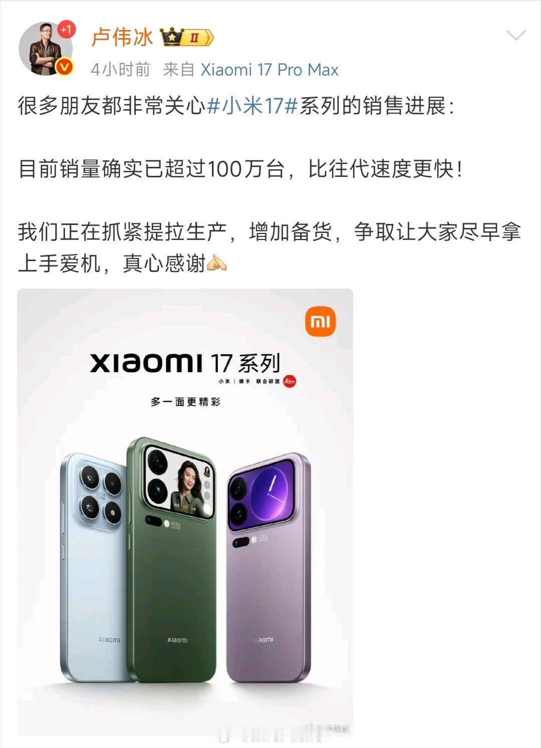 小米17系列销量破百万仅用5天,比前代小米15系列的10天纪录快了一倍,成功刷新销售速度。其高端机型Pro Max成最爆款,显示小米在高端市场已获认可,品牌冲高战略成效显著。