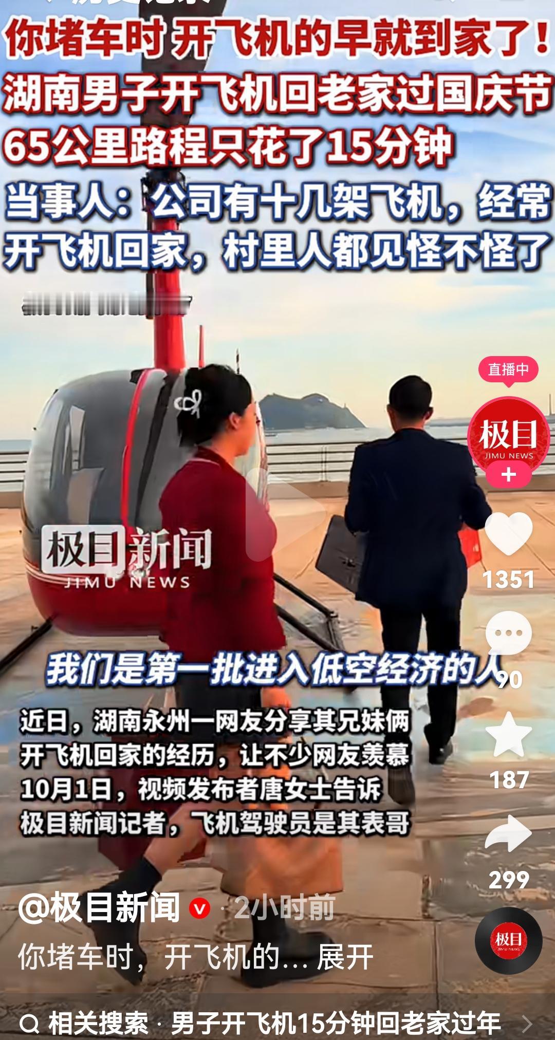 这又有开飞机回家的啦,看来下一个机会又来了 近日在10月1日过节回家时,湖南永州一网友分享了开飞机回家视频 唐女士说表哥陈陈先生,他平时在湖南永州市区上班,老家住永州市东安县鹿马桥镇,两地相距65公里,平时开车也需要1个多小时,如果堵车时间更长 但是现在开飞机也就15分钟就到家了 村里人也见怪不怪了,很多人都遇见过了 男子说他们公司有十几架这样的飞机,很多次就这样通行回家的 陈先生说这几年国家非常重视低空经济,他算是第一批接触这个行业的,公司有十几架这样飞机平时旅游观光,培训,科普,应急救援等业务非常忙 这确实方便啊,效率快,通勤方便啊小伙开飞机 安徽开飞机 开飞机自驾游 图片来自极目新闻视频