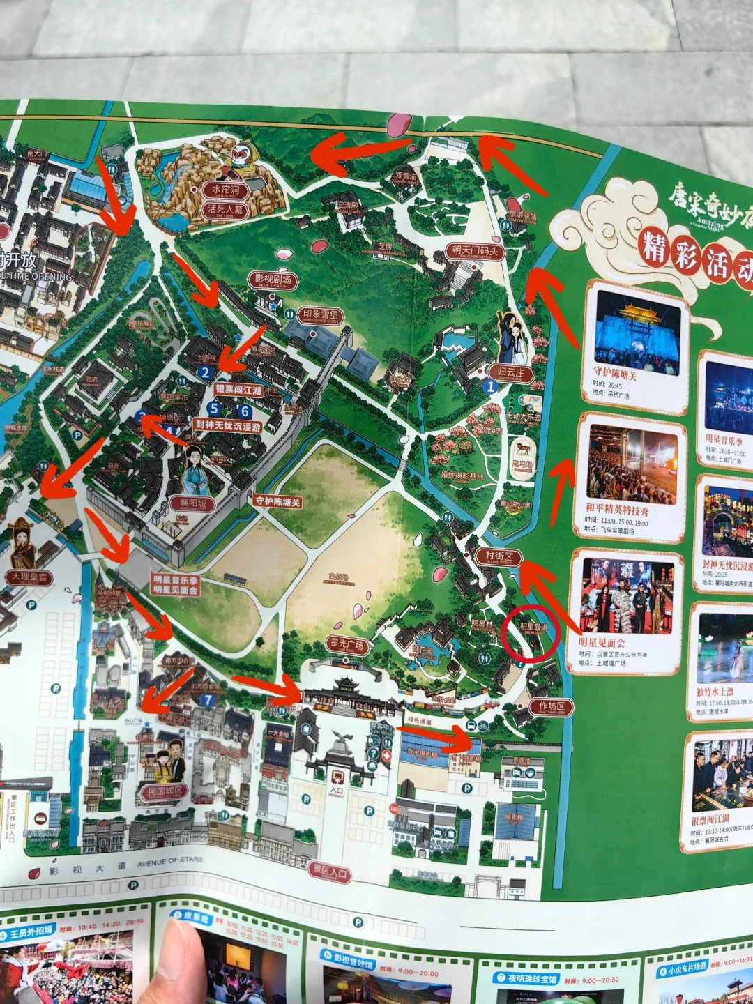 星光广场➡️ 作坊区➡️村街区➡️霍比特小屋(花特别好看)➡️活死人墓(寻找小龙女)➡️水帘洞➡️印象雪堡(冰雪世界🥶)➡️襄阳城➡️唐城➡️飞车实景剧场(位于大理皇宫上方)➡️春秋战国城➡️民国城