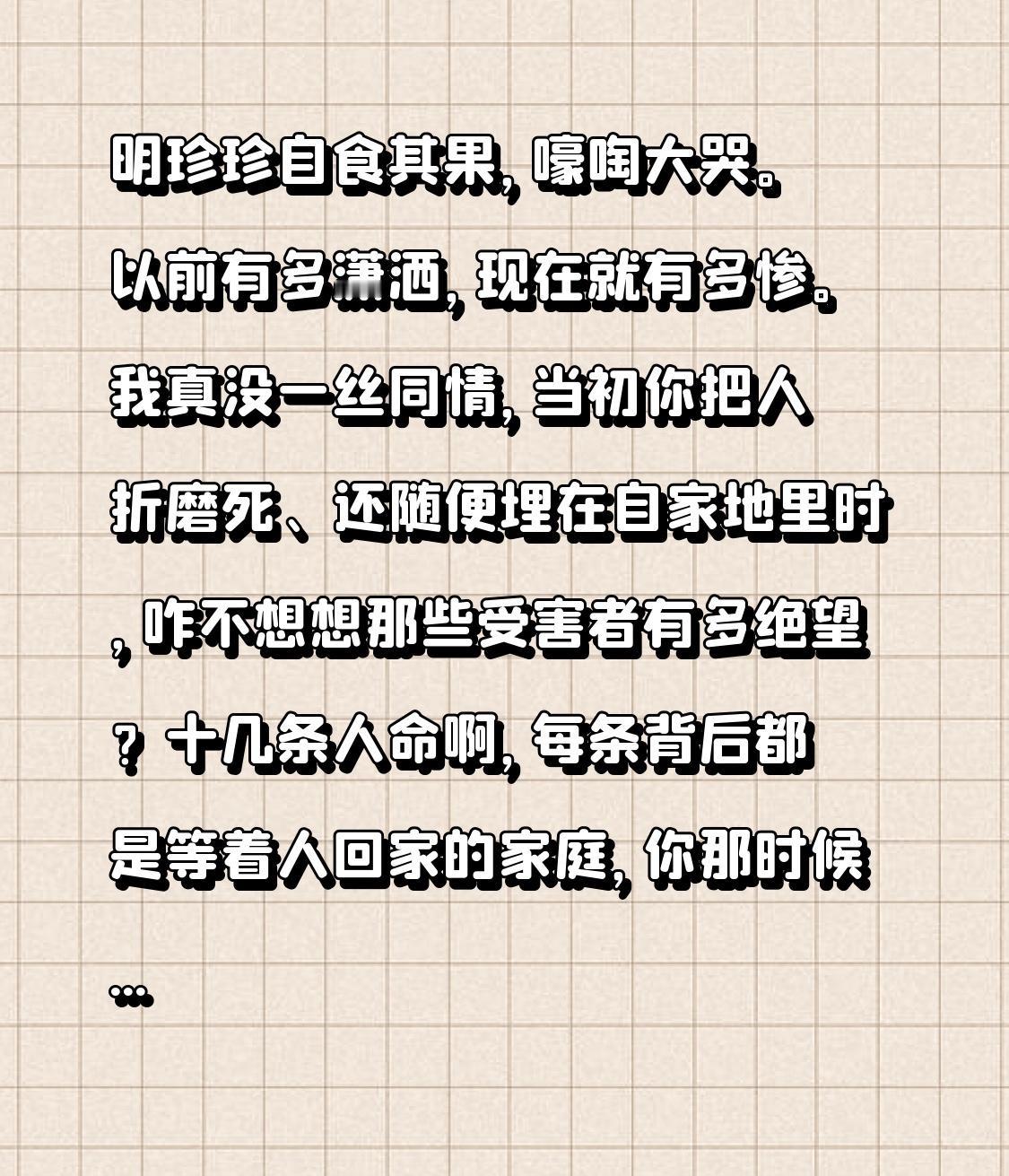 明珍珍自食恶果,嚎啕大哭。 曾经何等肆意,如今就有多凄惨。 我毫无怜悯之心,当初你折磨致人死亡,还随意埋尸自家地里,可曾想过那些受害者是多么绝望? 十几条人命啊,每条人命背后都是盼着亲人归来的家庭,你那时怎就没有一丝怜悯? 这哪算“惨”,分明是你作恶该付出的代价!你当初不是还嚣张地说“折磨死人不算啥”吗? 现在知道害怕、知道哭了?可那些被你夺去生命的人,连哭的机会都没有。 年纪轻轻不走正道,视他人生命如草芥,如今落到这般田地,就算死一百次,也难弥补对那些家庭的伤害。 别以为“便宜她了”是气话,真正解恨的,是让她永远铭记自己毁了多少家庭。 你们说说,对于这种拿别人生命当儿戏的人,要怎样让她偿还才对得起受害者?