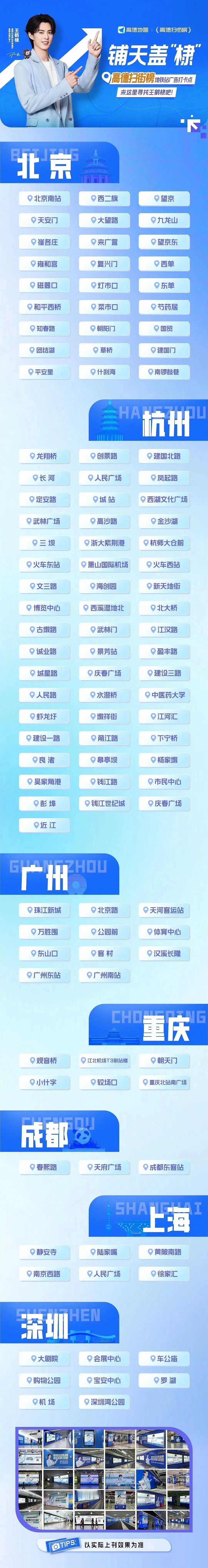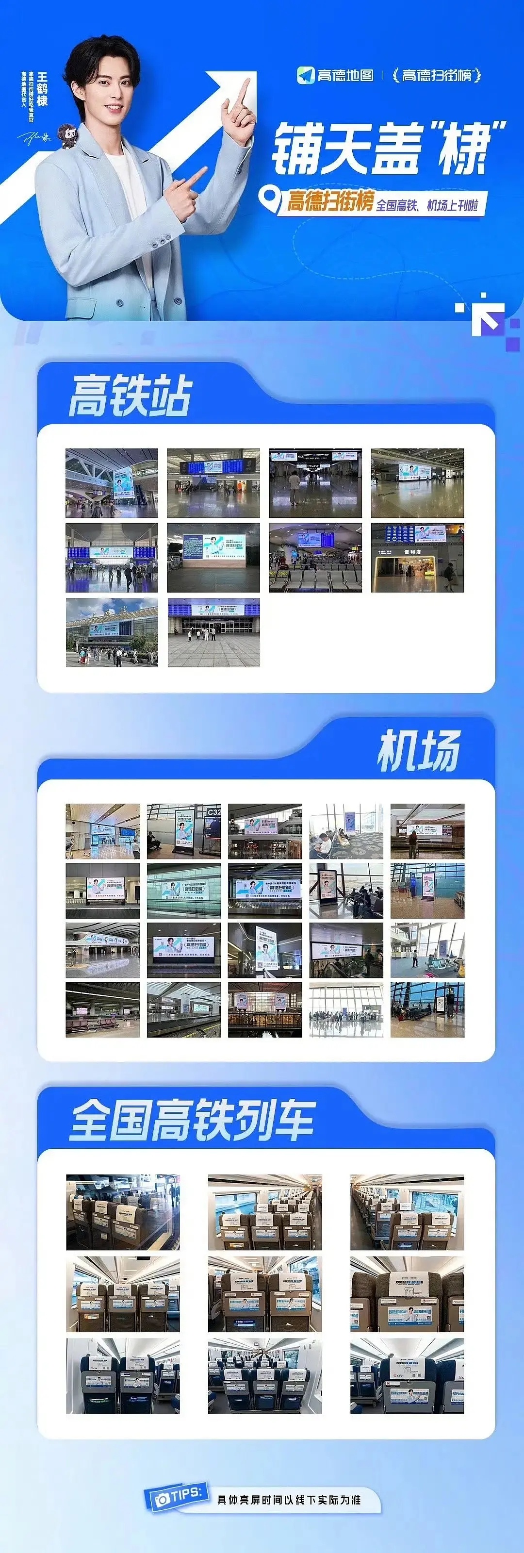 “不止线上霸屏,出门地铁站、公交站、高铁枢纽、机场大屏、小区电梯……放眼望去,全城都是王鹤棣高德扫街榜的身影”