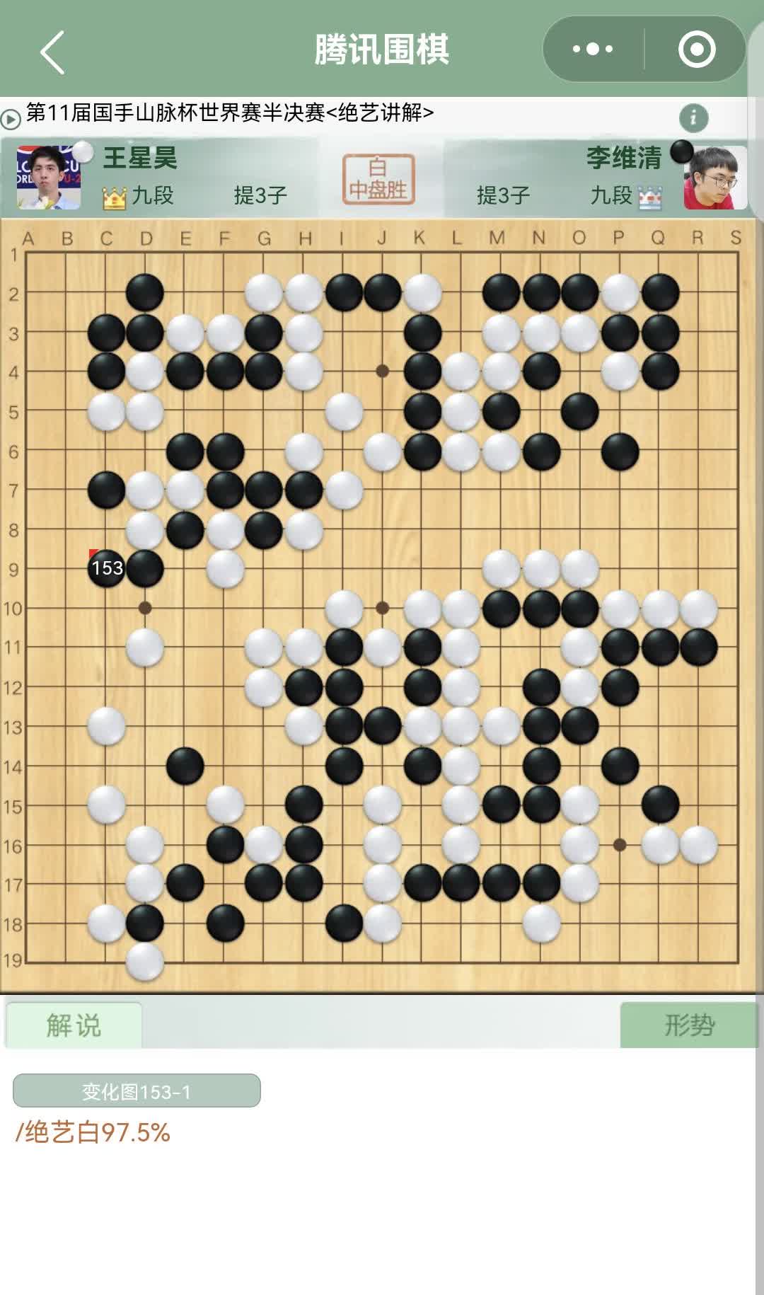 李维清九段黑153一手长降即将到手的第11届国手山脉杯决赛权拱手让给了王星昊九段! 10月1日上午国手山脉杯上半区半决赛由李维清九段执黑对弈王星昊九段。 当王星昊九段白152拐打时,此时执黑的李维清九段应该如(图五)1位冲,这样左上黑棋通过滚包,吞吃白三子,黑棋胜率87%,胜利的曙光就在眼前。实战李维清九段产生错觉,在黑153立,白154冲后黑棋分为三块,黑棋胜率降了八十多点。后面李维清九段走了数手无法改变左边黑数子被杀的局面,白172时投子认负! 本届山脉杯中国三名棋手都在上半区,是抽签的巧合还是韩国竞技体育精神的体现?总之无法像上届三星杯那样实现对冠亚军的合围 ,悬念只能留在决赛在。希望王星昊九段在国庆大喜的日子,不辱使命 凯旋而归!加油!