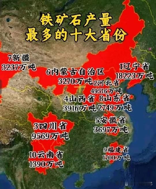 中国铁矿石产量前十大省份数据水平情况,辽宁省铁矿石产量以18223万吨排名榜一,可见辽宁省属于我国铁矿石产量最高的省份。