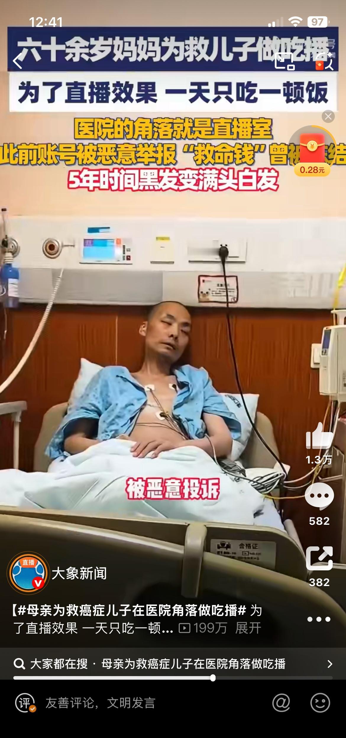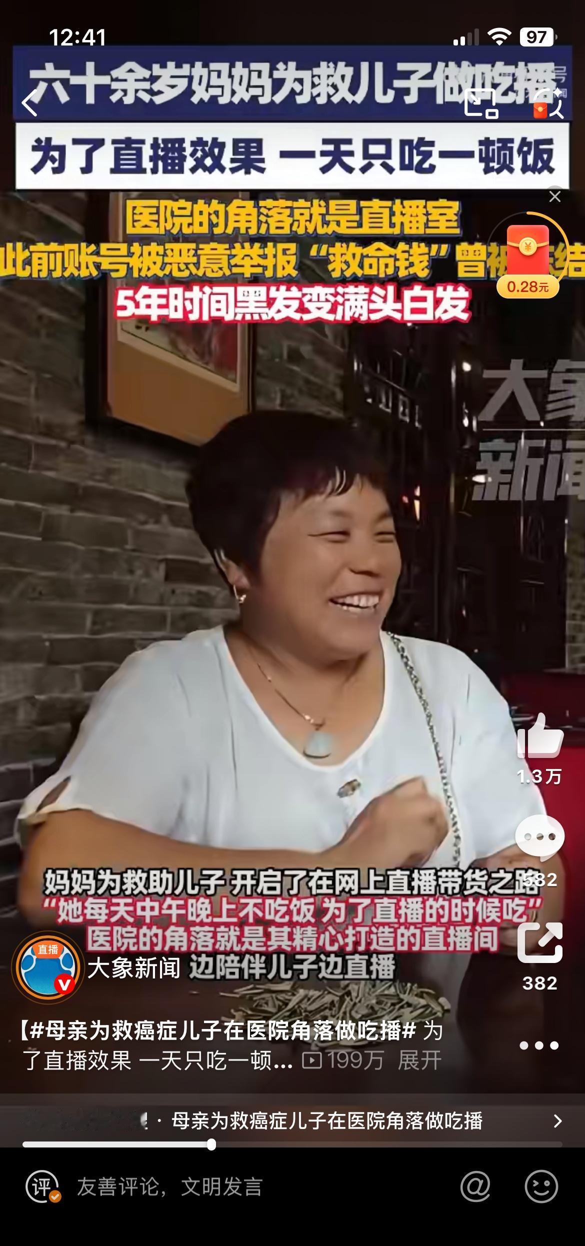 医院角落的直播镜头里,母亲丰振东为救患癌13年的儿子,用“一天只吃一顿饭”的极端方式换取直播效果,这画面比任何剧本都令人揪心。 她的吃播不是博眼球的噱头,是走投无路时,用饥饿和尊严铺就的求生路,每一筷子吞咽都承载着救子的希望。 然而,账号遭恶意举报封禁、佣金保证金被扣,却给这场绝境自救浇了盆冷水。 当一个母亲在医院走廊里,把陪伴与直播拧成救命绳时,我们更该看见的是底层家庭抗癌的艰难,而非苛责直播形式。 幸运的是账号最终解禁,但这背后,藏着多少未被看见的、同样在绝境中挣扎的“丰振东”? 对他们多一分理解,少一分恶意,才是对生命最基本的善意。