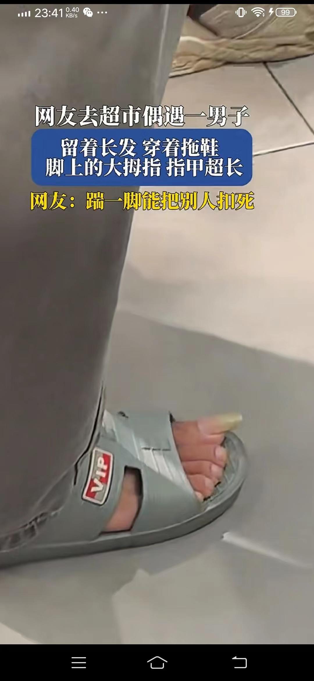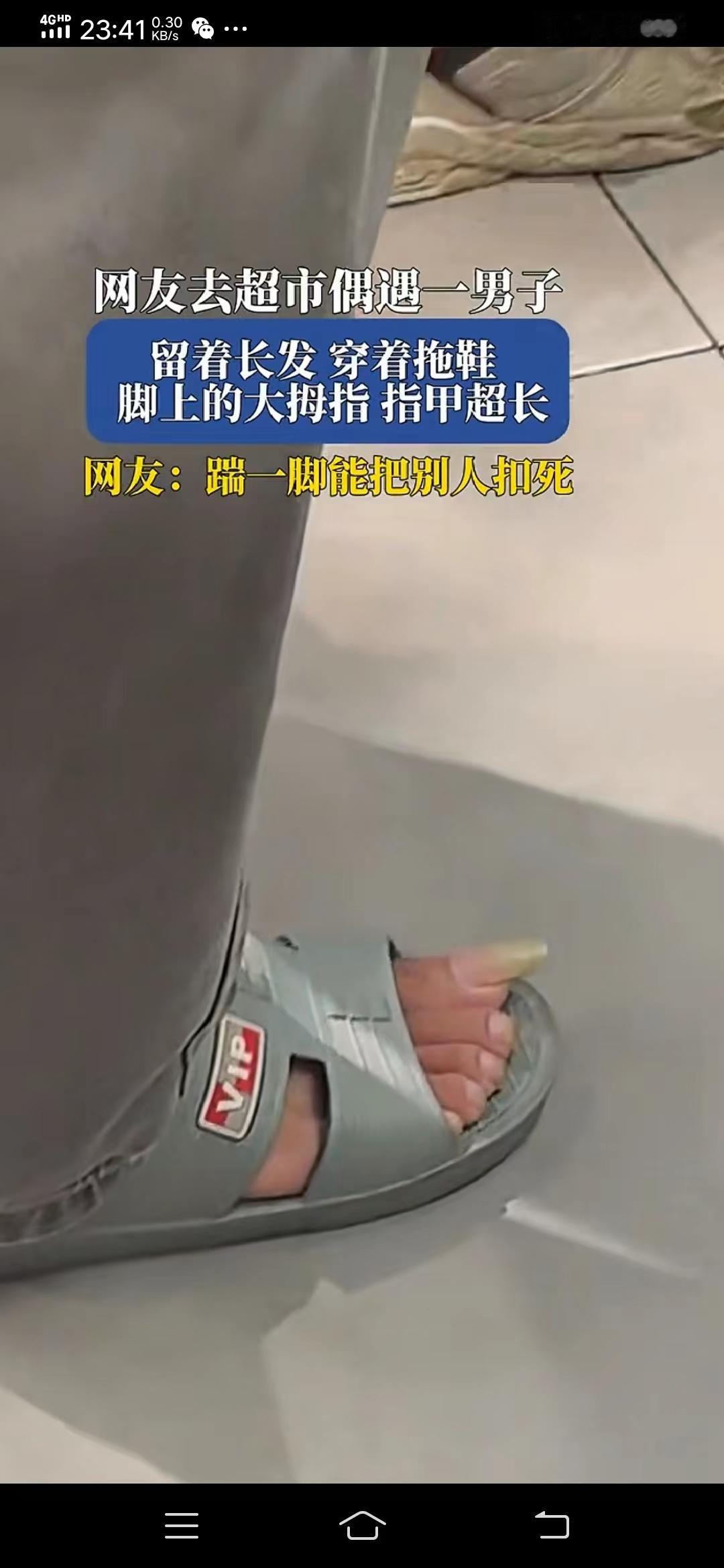 这是在超市见到的一幕,一中年男子,头发齐肩很多很厚,似乎十几年没理过发一样,脚指甲也是有两三公分长,看着有点恶心、有点害怕。