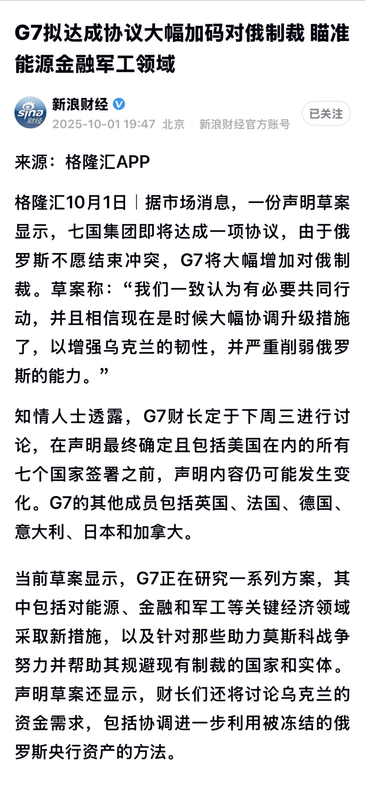 G7表示将打击增购俄石油的国家 七国集团(G7)财长会议后发表联合声明,宣布将采取联合行动进一步向俄罗斯施压,重点针对那些在俄乌冲突爆发后仍大幅增加购买俄罗斯石油、或协助规避相关交易的国家。 声明称,将考虑通过关税、进出口禁令等贸易措施限制俄罗斯收入,并对为俄罗斯提供战争资金支持的国家及实体实施制裁,包括限制源自俄罗斯石油的精炼产品。 另据报道 欧盟领导人于哥本哈根举行的非正式会议因在如何处理俄罗斯被冻结资产、乌克兰入盟及内部改革三大关键议题上存在严重分歧,未能达成一致。