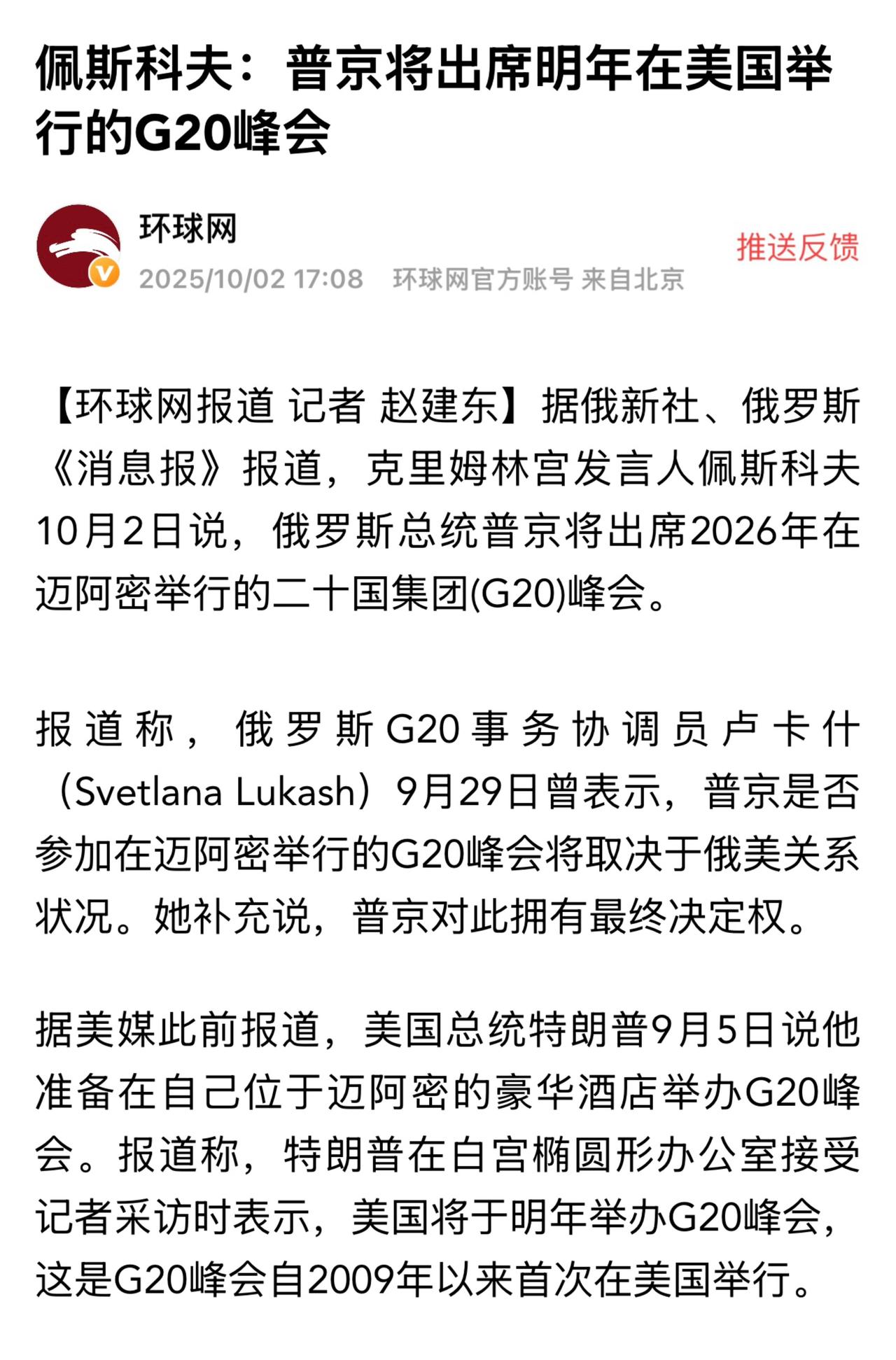 2026年G20峰会定于12月在美国佛罗里达州迈阿密市特朗普国家高尔夫俱乐部举行。 2025年G20峰会定于11月在南非约翰内斯堡召开。这是G20峰会首次在非洲大陆举办。