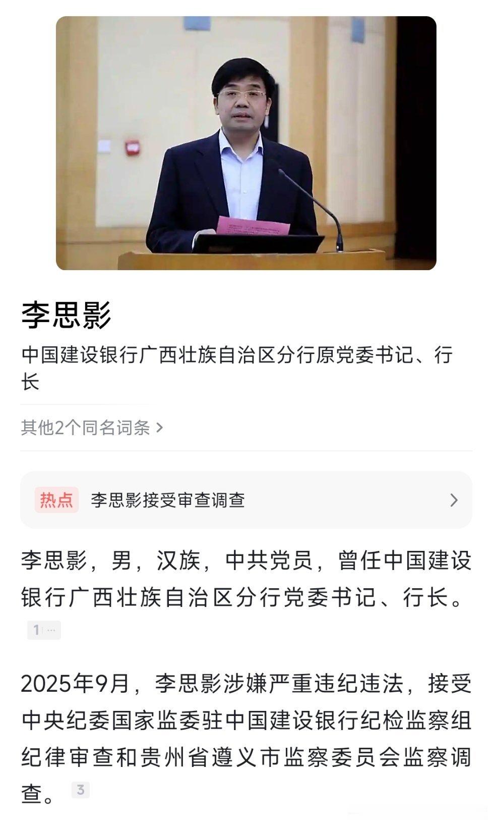 据中央纪委国家监委驻中国建设银行纪检监察组、贵州省纪委监委9月30日消息:中国建设银行广西壮族自治区分行原党委书记、行长李思影涉嫌严重违纪违法,目前正接受中央纪委国家监委驻中国建设银行纪检监察组纪律审查和贵州省遵义市监察委员会监察调查。热点现场