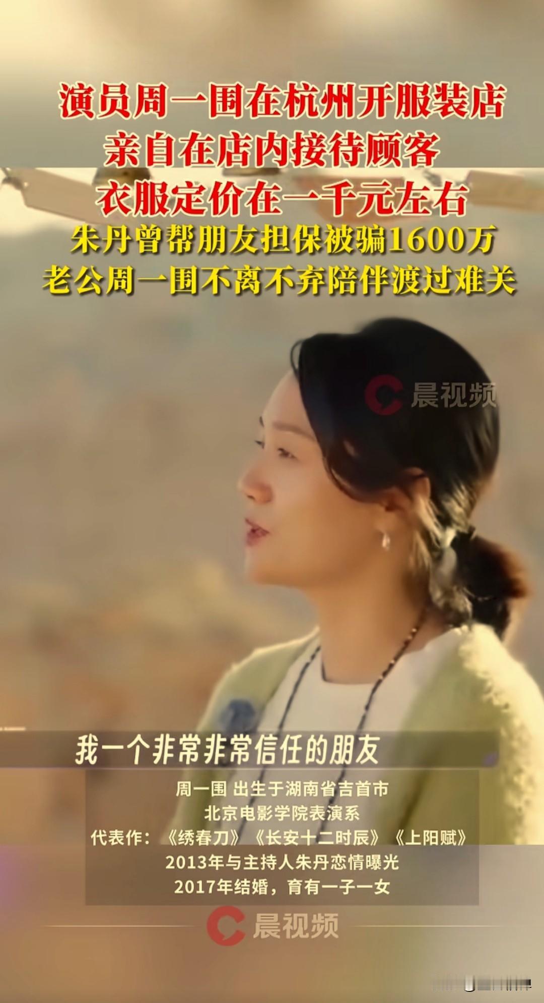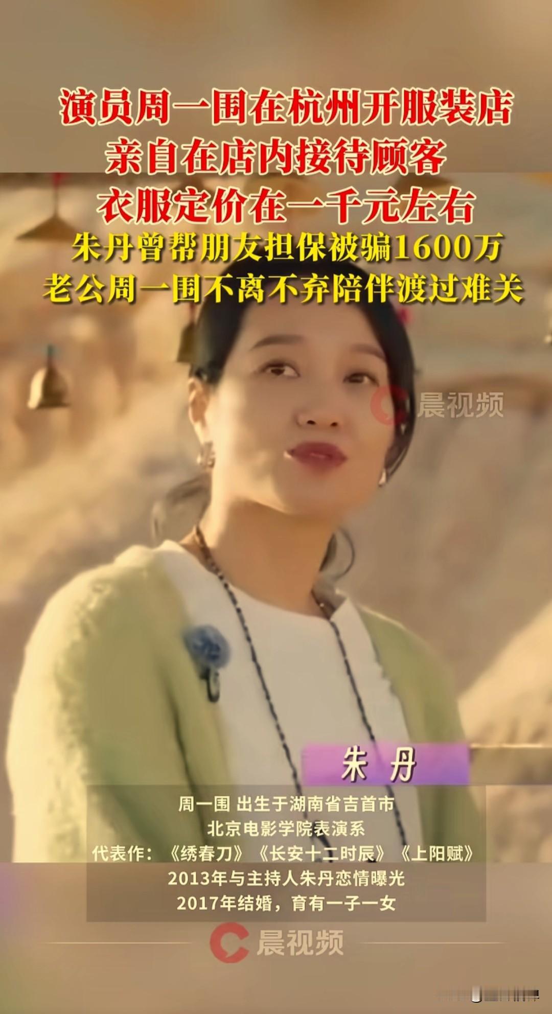 演员周一围在杭州开了一家服装快闪店,亲自在店内接待顾客,介绍自己的产品,和大家交流,店内服装单品定价大多在一千元左右。 老婆朱丹曾为了帮助朋友,在一张空白纸上签名,结果这个签名被朋友用在了在一份1600万元的借款担保合同上。 此事导致朱丹背负上了巨额债务,朱丹通过法律途径维权并胜诉,但是因对方破产等原因,债务执行一度陷入困境。 在此事发生后,周一围一直陪伴在朱丹身边并支持她渡过难关。 来源:潇湘晨报·晨视频