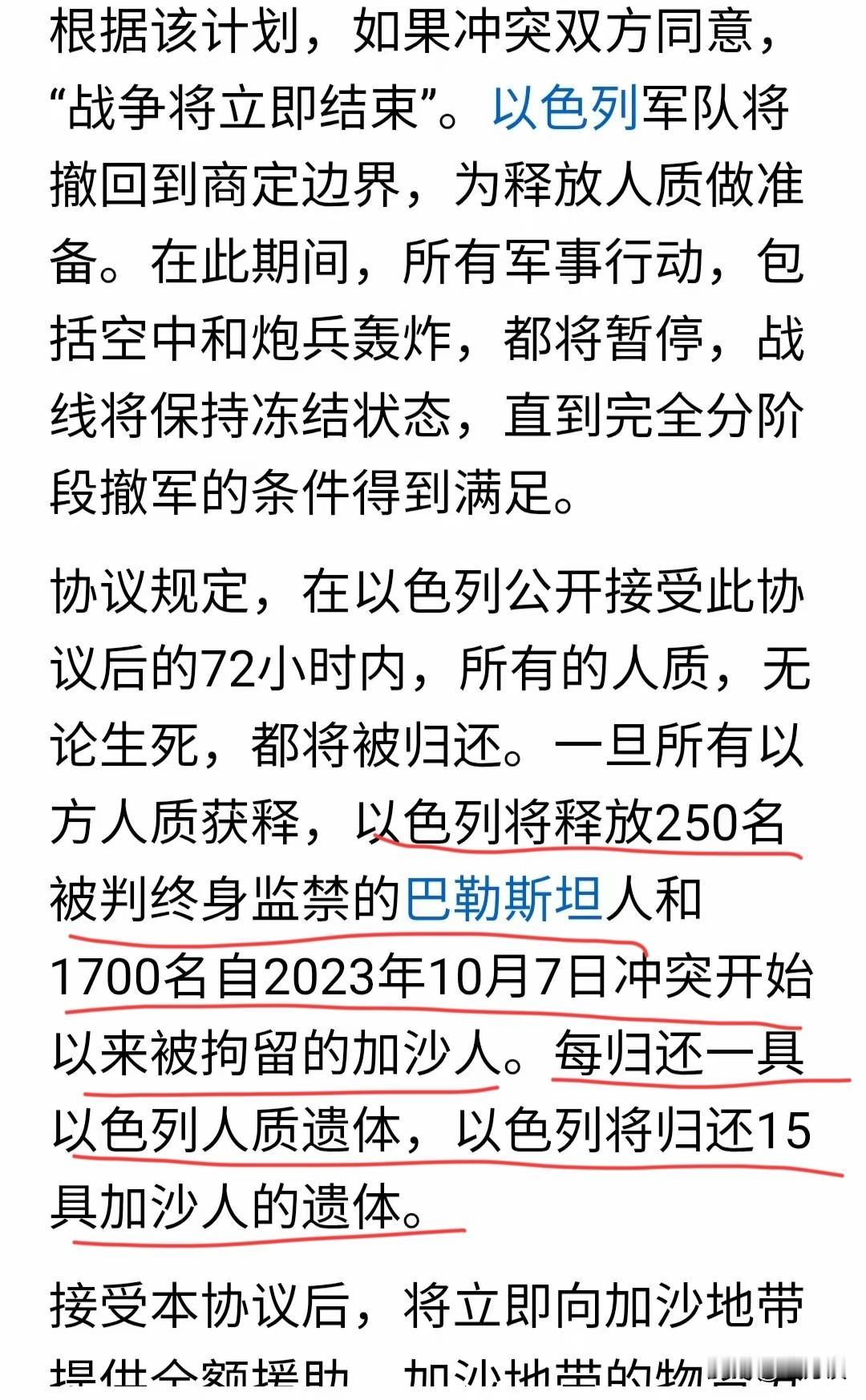 特朗普就关于结束加沙冲突提出了20点计划。根据特朗普的20 点计划可知,死在以色列人手里的巴勒斯坦人真是太多了,仅仅交换尸体就达到了1:15,太多了!巴勒斯坦人真是被打的七零八落了,巴勒斯坦人每交出一具以色列人尸体,那么就可以换回15具巴勒斯坦人尸体。而且被以色列人关押的巴勒斯坦人最起码有好几千人,这场加沙冲突,完全就是碾压型的战役,或者更确切的说,完全就是一场屠杀,是一场以色列人对巴勒斯坦人的屠杀。