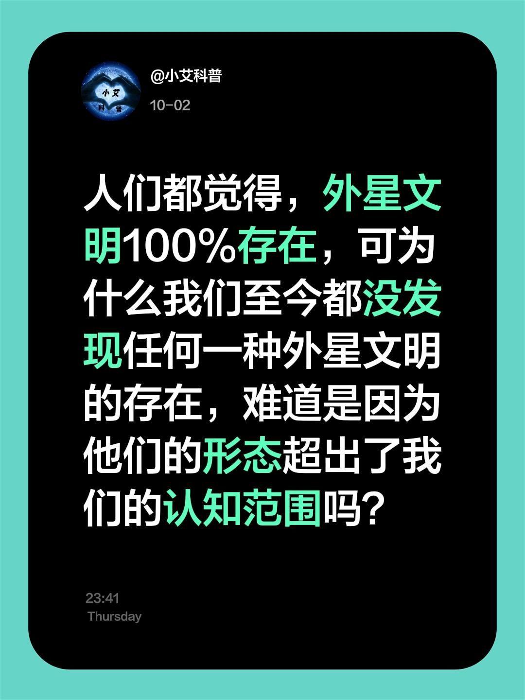 人们都觉得,外星文明100%存在,可为什么我们至今都没发现任何一种外星文明的存在,难道是因为他们的形态超出了我们的认知范围吗?