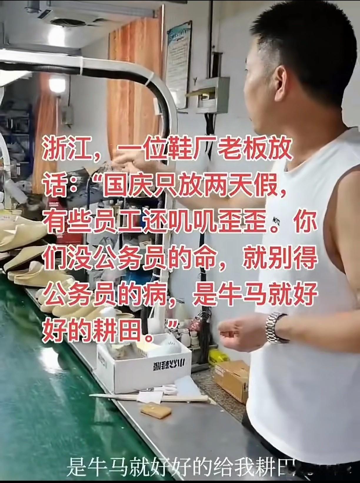是牛马就好好耕田! 说的太对了,这位鞋厂的老板,虽然话说的很糟心,道理却很现实,国庆假期对我们底层人来说,没有太多的意义。 休一天就少一天的工资,人家休一天,那是带薪休假,你怎么跟人比。 我突然明白了一个道理,你既然是牛马就不要去抱怨,老老实实乖乖听话去干就完事了。