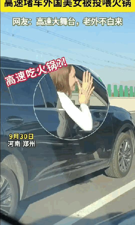 9月30号,郑州高速上车全堵死了,一对中国车主饿得实在扛不住,打开后备箱,支起小