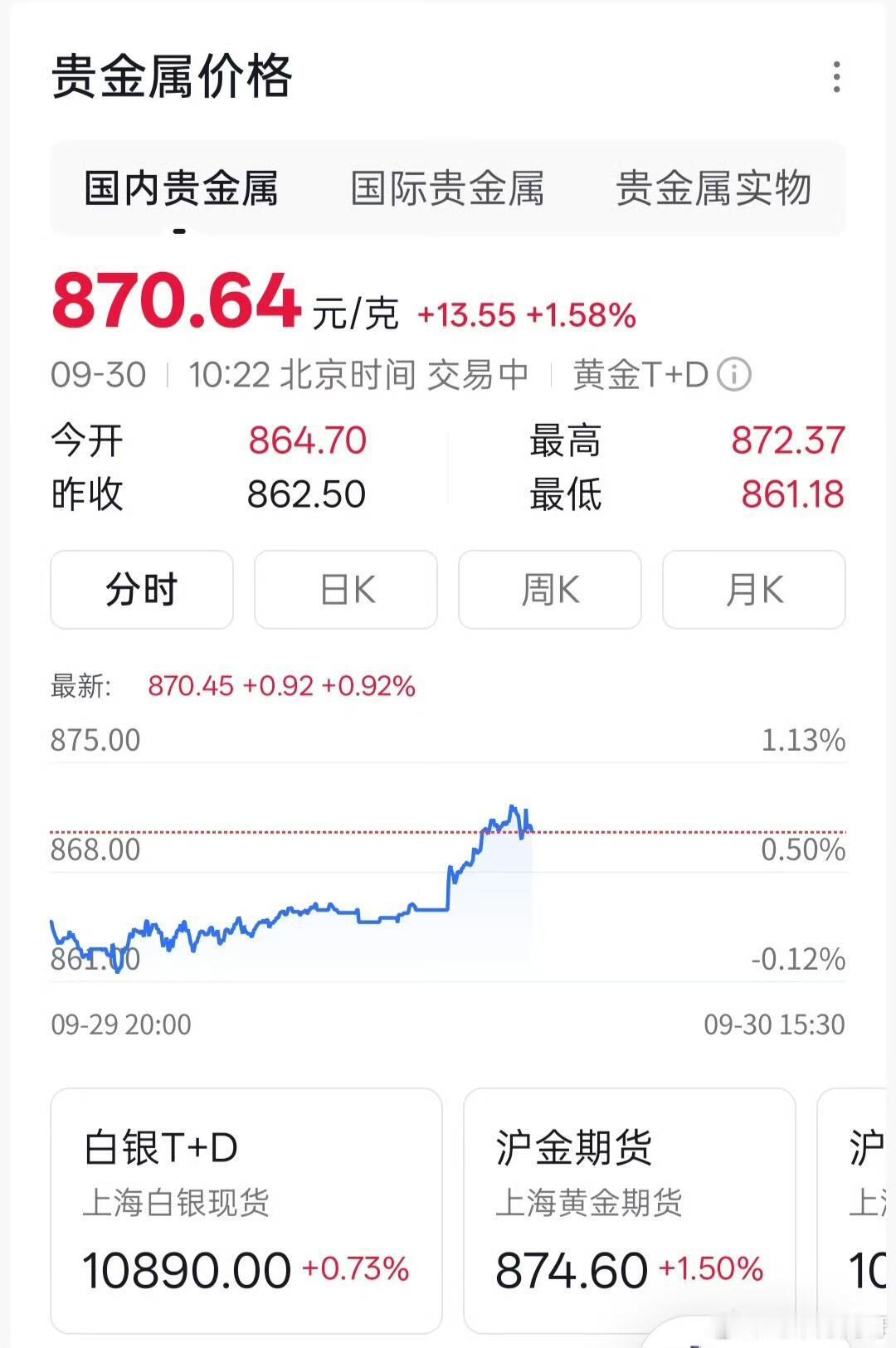 好家伙,黄金这是要上天啊!今天一开盘,国内金价直接冲到876块一克,收盘还稳在8