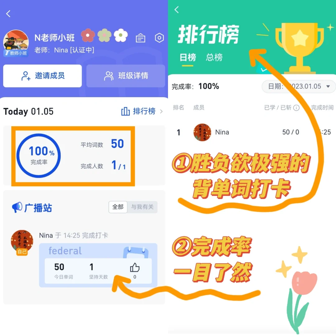 ↗️可以一目了然大家完成情况,每日光荣榜调动学生背单词积极性→⛳让背单词从此和打游戏一样,胜负欲极强!秒治背单词的拖延症!