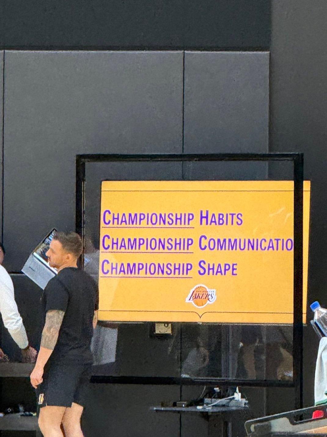 为了让球员们更高的要求自己,湖人在训练馆内竖起了一块牌子,上面写着:冠军的习惯,冠军的沟通,冠军的体型。