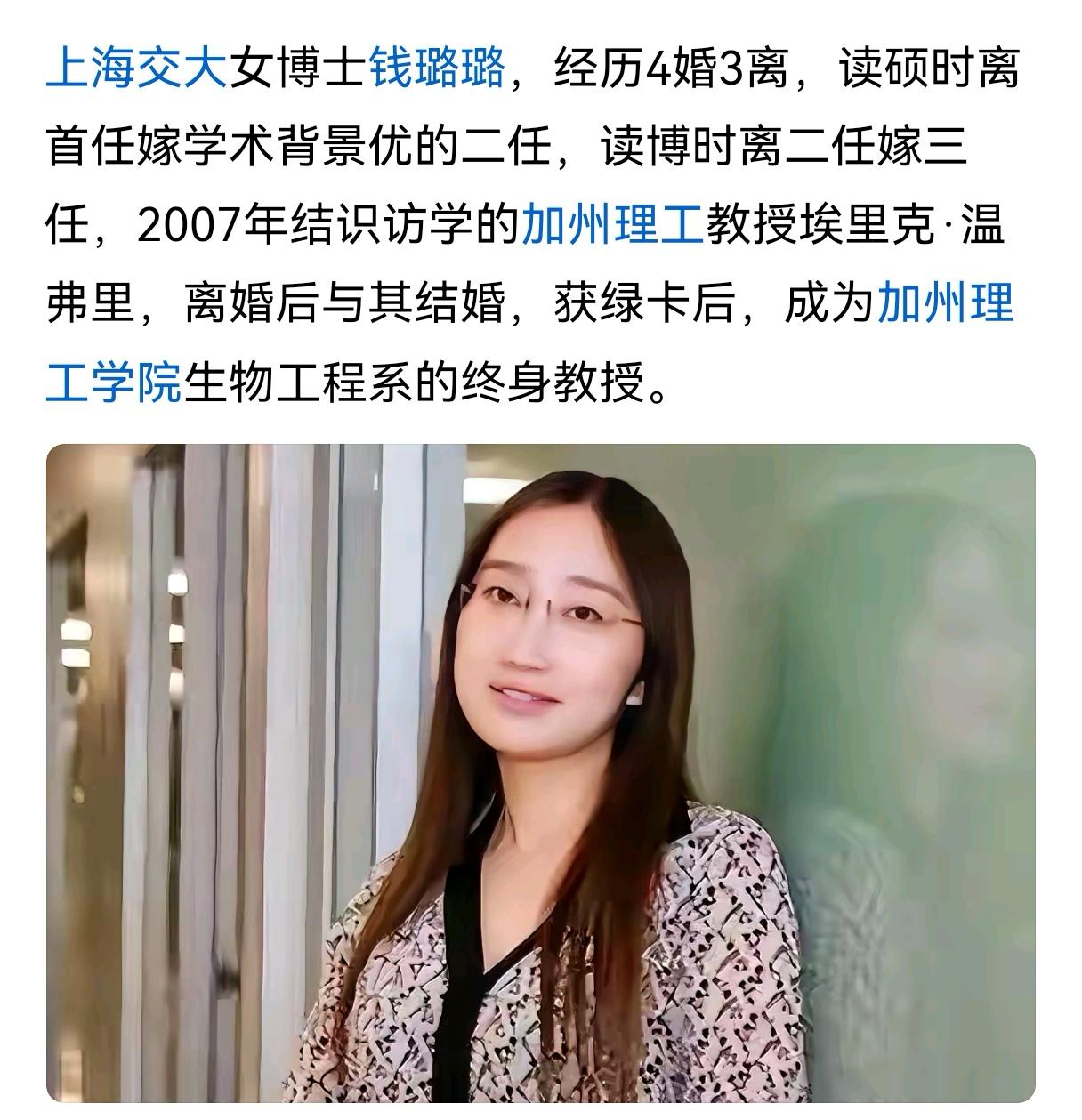 以婚姻为抓手,拼事业的女人不只钱璐璐 四婚三离,每次踩一个男人的肩膀进一步,最后成了加州理工学院的终身教授,这婚姻太值得了。只付出皮囊、不付出真心的婚姻不重要,让自己成长才重要。 像钱璐璐这样的女并不少。一个政府招待所的临时工,经过几次倒卖婚姻,成了管教育的副县长。一个打字店的女工,通过反复结婚,成了县教育系统的名师。婚姻不再是忠诚,是晋升的阶梯。