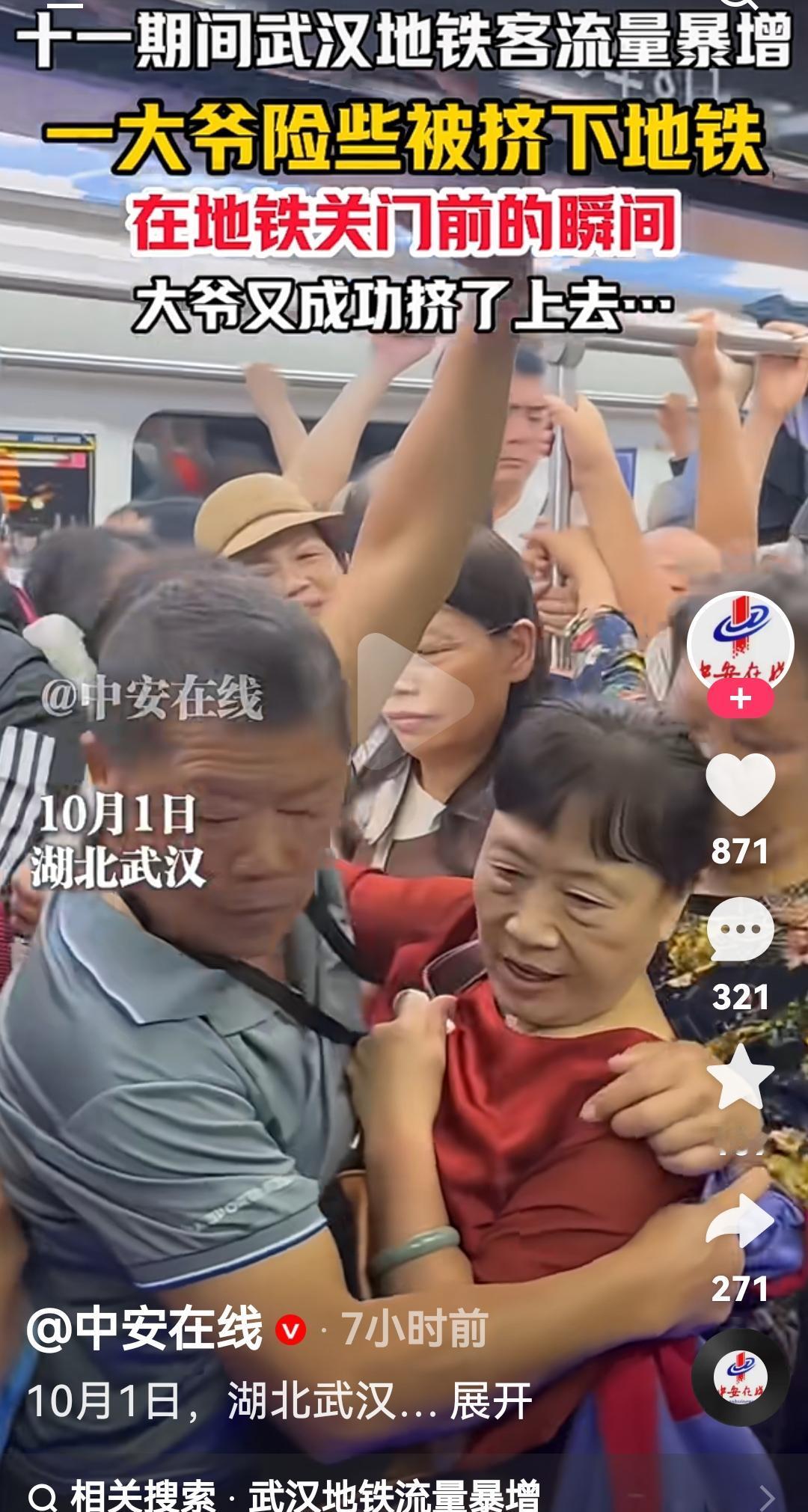 武汉十一国庆节人这么多吗 大爷和大妈都挤成这样了 一个大爷险些被挤下地铁 后来又