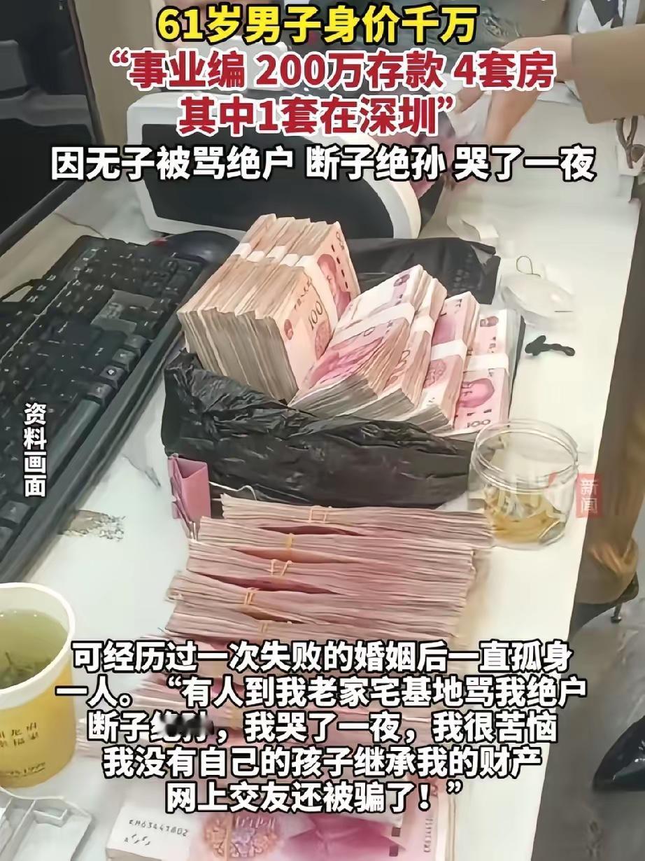 河南一位61岁的男子颇为苦恼,他坐拥200万存款和4套房,其中一套位于深圳,身价千万,却无人继承自己的产业。只因没有子女,他被骂作绝户、断子绝孙,为此哭了一夜。 男子曾经历过一段失败的婚姻,此后便一直单身。他怎么也想不明白,为何自己身价千万,却膝下无子?有一种可能是男子没有生育能力,不过这也只是猜测。 有人有钱却没儿子而苦恼,有人有儿子却没钱也苦恼,人生本就没有十全十美。也许你所拥有的,正是别人梦寐以求却无法得到的。男子不妨领养一个孩子,等自己老了,孩子既能陪伴照顾自己,也能继承,你对生育率低下的原因有什么见解?
