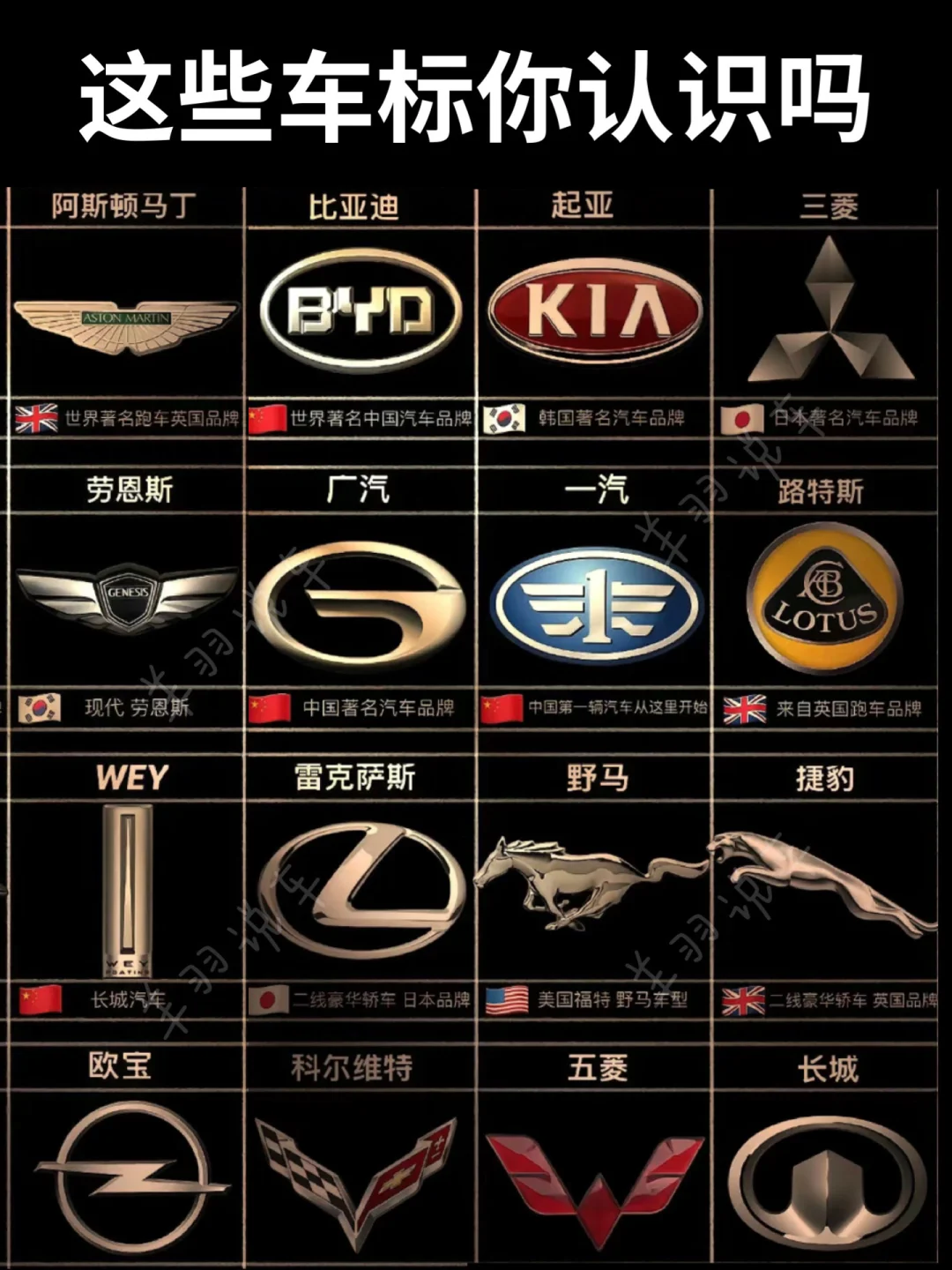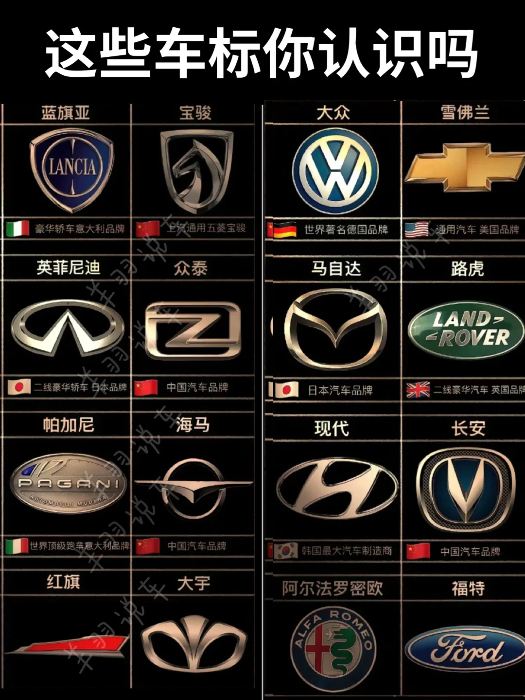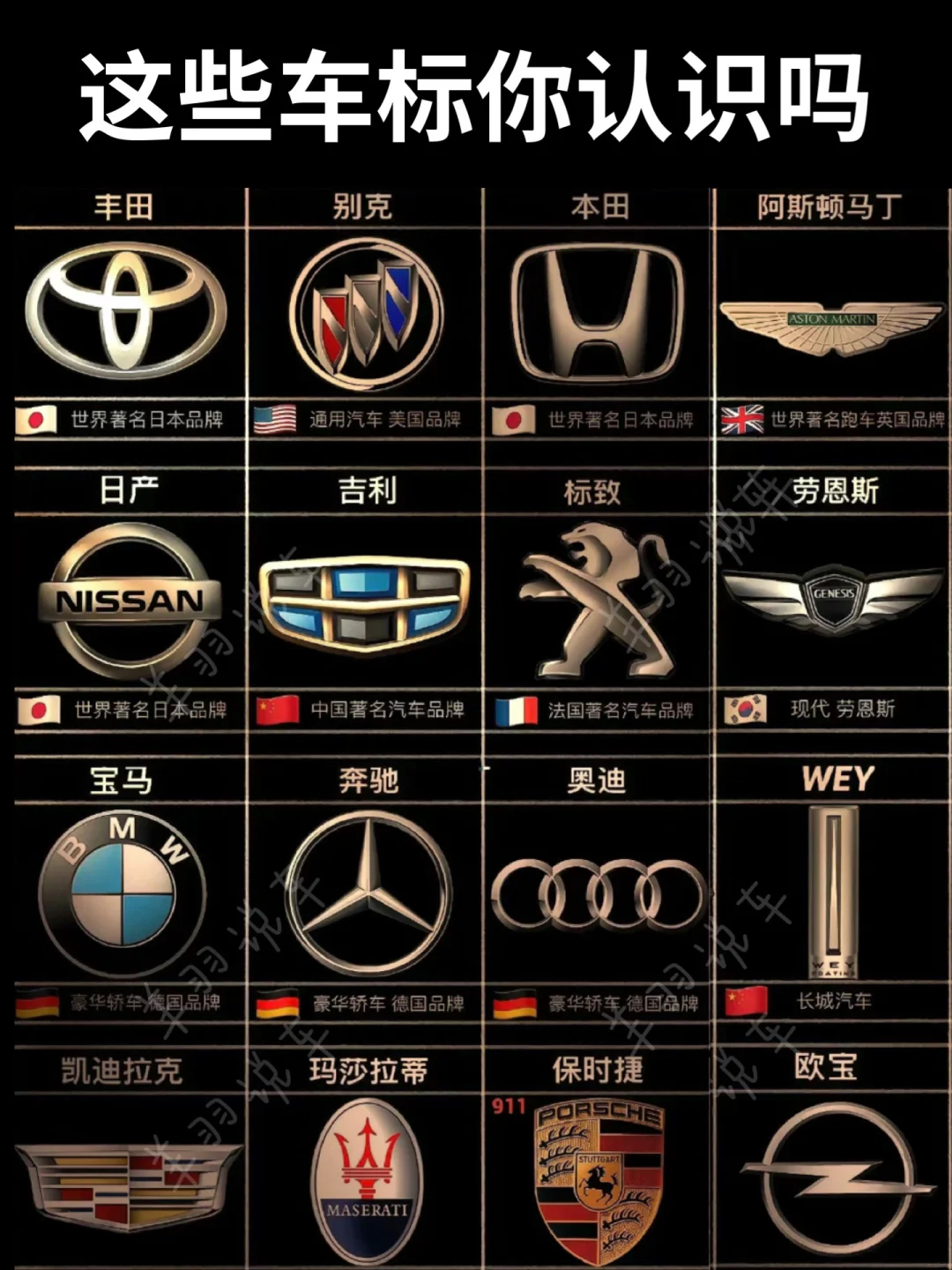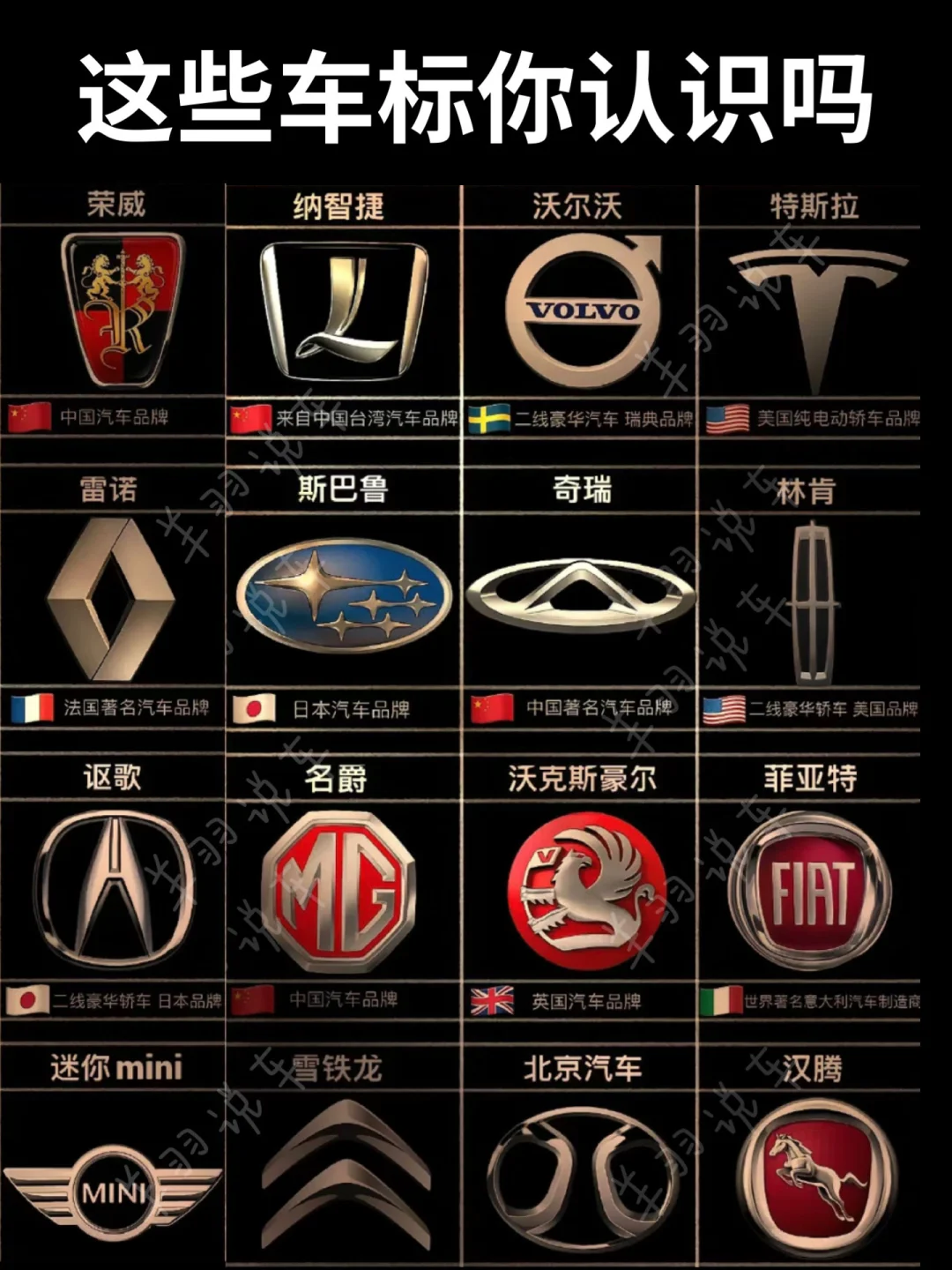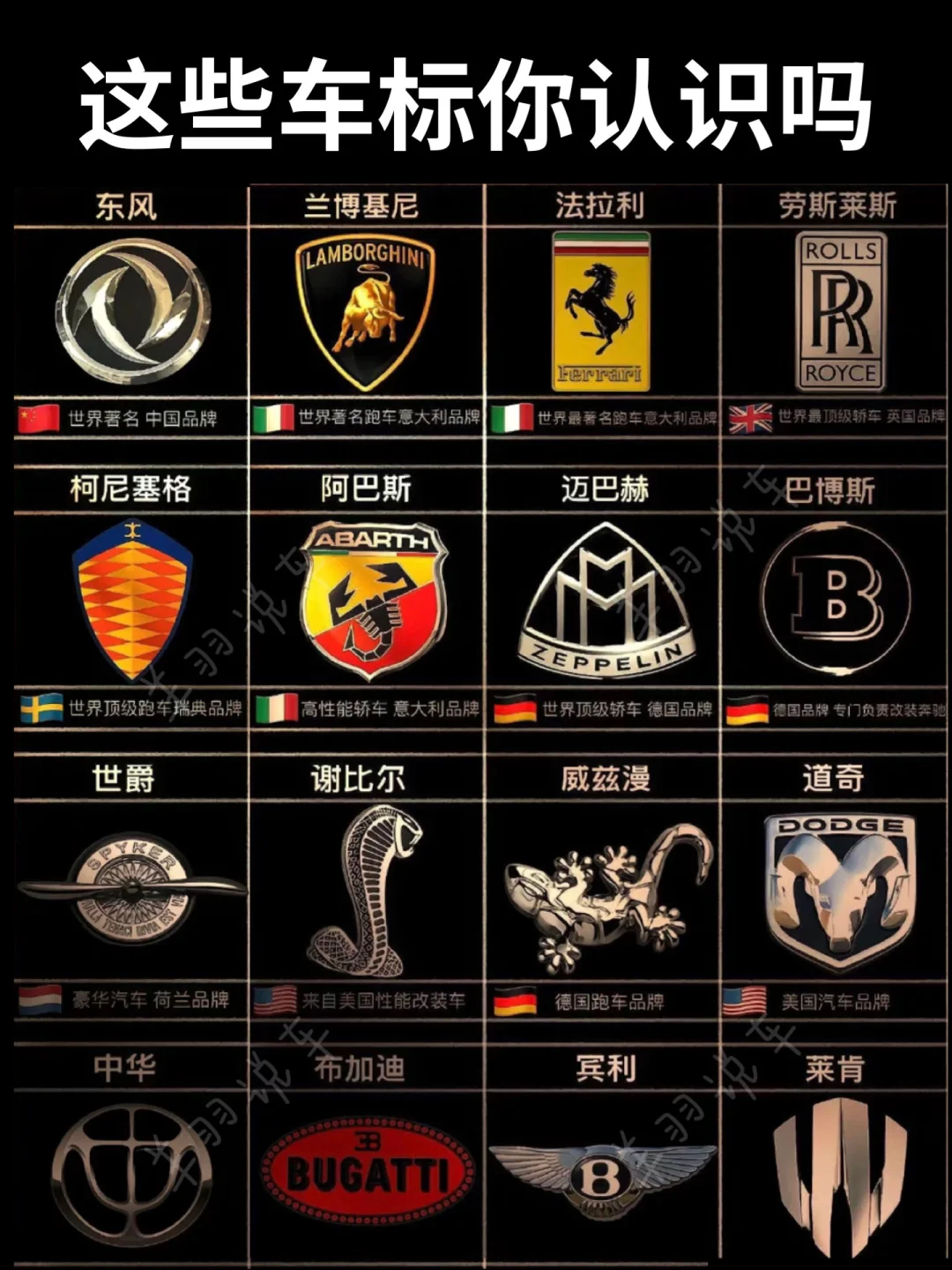🚩自有品牌:有红旗、比亚迪、奇瑞、长城、长安、蔚来、小米、理想、小鹏、问界、吉利、领克、极氪等。红旗是国产豪华品牌的代表;比亚迪在新能源领域表现出色;奇瑞技术实力不俗;长城 SUV 深受欢迎;长安车型丰富;蔚来定位高端智能电动汽车。 🇺🇸美国:雪佛兰、别克、凯迪拉克、福特、特斯拉、林肯等。雪佛兰车型多样,涵盖轿车、SUV等;别克历史悠久,品质有保障;凯迪拉克以豪华著称;福特经典车型众多;特斯拉引领电动汽车潮流;林肯主打高端豪华。 🇬🇧英国:捷豹、迈凯轮、路虎、宾利等。捷豹车型优雅动感;迈凯轮专注超级跑车;路虎越野性能强大;宾利尽显奢华。 🇩🇪德国:大众、宝马、奔驰、保时捷等。大众车型普及度高;宝马操控性能出众;奔驰豪华舒适;保时捷以高性能跑车和豪华 SUV 闻名。 🇮🇹意大利:法拉利、兰博基尼、玛莎拉蒂等,都是顶级跑车品牌,造型炫酷,性能卓越。 🇫🇷法国:标致、雪铁龙、雷诺等,设计独特,具有法式浪漫风格。 🇸🇪瑞典:沃尔沃、萨博等,以安全性能闻名。 🇯🇵日本:丰田、本田、日产、铃木等,经济实用,技术成熟。 🇰🇷韩国:起亚、现代、双龙等,性价比高,市场表现不错。