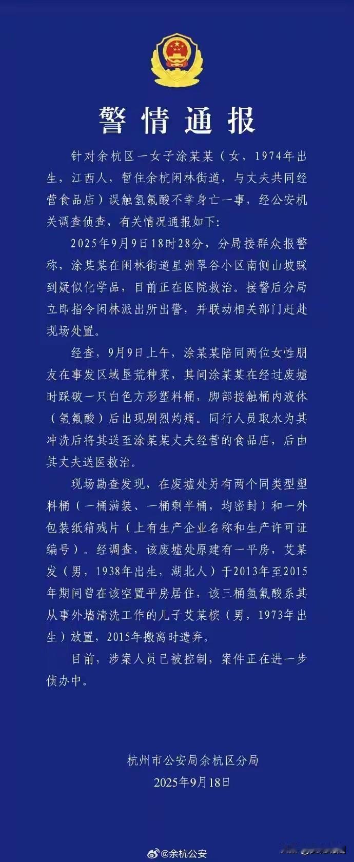 女子踩“化骨水”身亡案的肇事者找到了,是一名从事外墙清洗工作的52岁男子在2015年搬家时遗弃的![送心] 9月初,杭州余杭区一名52岁的涂女士在废弃平房附近开垦菜地时,不慎踩破一个塑料桶,桶内的液体溅到她的腿部。这个桶里装的是氢氟酸,一种强腐蚀性的化学品。尽管涂女士立即被送医抢救,但还是不幸离世。 警方调查发现,这桶氢氟酸已经在那里放了十年。2015年,一名从事外墙清洗工作的男子搬家时,把工作用的三桶氢氟酸留在了父亲居住的平房里。后来老人过世,房子闲置,这片区域逐渐荒废。涂女士看中了这块空地,准备种点蔬菜,没想到遇到了这场意外。 这名男子和他的父亲目前已被警方控制,很多人关心,他们会承担什么样的法律责任? 从法律层面看,关键要判断这名男子的主观态度。如果他明知道这些化学品很危险,故意把它们扔在公共场所不管,那就可能构成投放危险物质罪,这是重罪,判刑可能在十年以上。但根据警方通报,这些氢氟酸当初是放在有人住的平房里,并不是直接扔到公共场所,所以是否属于故意投放,还有讨论空间。 但这不代表他就能逃脱刑事责任,作为外墙清洗行业的从业者,他应该很清楚氢氟酸的危险性。搬家时不妥善处理这些危险品,很可能构成过失投放危险物质罪。按照刑法规定,过失投放危险物质导致他人死亡的,可判处三到七年有期徒刑。 除了刑事责任,他还要承担民事赔偿,包括医疗费、丧葬费、死亡赔偿金等。这些费用加起来,通常会是一笔不小的数目。 这起事故暴露出一个容易被忽视的问题,危险化学品用完之后该怎么办? 氢氟酸属于剧毒物质,已经被列入《危险化学品名录》。按照规定,这类化学品必须存放在专用仓库或储存室,由专人管理。个人根本不应该私自储存这么危险的东西。用剩下的危险化学品,必须交给有资质的专业机构处理,绝对不能随便找个地方一扔了事。 但现实中,很多小企业、个体户甚至家庭作坊都会用到一些危险化学品。这些人往往缺乏安全意识,也不知道正规的处理渠道在哪里。有的人觉得麻烦,就随手扔掉,有的人觉得“反正放在自己家里”,就一直堆着。殊不知,今天的“自己家里”,明天可能就变成别人的活动范围。 专业人士建议,如果发现来路不明的容器或化学品,千万不要碰,应该第一时间报警,让环保部门派专业人员来处理。 万一真的不小心接触到氢氟酸,该怎么办? 氢氟酸的可怕之处在于,它不仅会腐蚀皮肤表面,里面的氟离子还会渗透进皮肤深层,甚至到达骨骼,和钙离子发生反应。这个过程会引发剧烈疼痛,造成组织坏死,严重时可能导致心脏衰竭。即使只是小面积接触,也可能致命。 如果不幸接触到,最重要的是立即用大量清水冲洗,至少要冲20到30分钟。冲洗之后,可以用淡肥皂水或2%到5%的氢氧化镁溶液涂抹伤口。需要特别注意的是,千万不要在没冲洗的情况下直接用酸碱中和,那样反而会加重伤害。处理完之后,再用清水把中和溶液冲干净。 做完这些紧急处理,一定要马上去医院。这些自救措施只是为了减轻伤害,不能代替专业治疗。氢氟酸中毒需要特殊的解毒剂和治疗方案,拖延可能致命。 这起悲剧让人想到,危险化学品的管理不能只靠使用者自觉。从购买、使用到废弃处理,每个环节都应该有明确的监管和便捷的处理渠道。 对于使用危险化学品的企业和个人来说,应该建立强制回收机制。比如购买时交押金,处理完后退押金,或者由销售商负责回收,不回收就吊销经营资格。这样能从源头上减少随意丢弃的情况。 对于监管部门来说,应该定期排查那些可能存放危险品的场所,尤其是废弃的厂房、仓库、民房等。这些地方往往成为管理盲区,一旦有人接触,后果不堪设想。 对于普通人来说,了解一些基本的化学品安全常识很有必要。遇到不明容器、刺鼻气味、腐蚀痕迹等异常情况,要保持警惕,远离并报警,而不是出于好奇去触碰。 涂女士的离世令人痛心,她只是想在空地上种点菜,却因为别人十年前的疏忽而付出了生命的代价。这个代价太沉重了。我们需要的不是事后的惋惜和谴责,而是实实在在的制度改进和行为改变,让类似的悲剧不再发生。 😢 网友热议: “丢弃氢氟酸的人太不负责任了!” “有时候危险真的防不胜防”,并提醒大家“尽量不要进入那些无人管理的废墟、工地,谁知道里面藏了什么”。 “这么毒的东西,为什么个人能轻易拿到,又能随便扔掉?” 💬 互动提问: 您认为这起悲剧的主要责任在谁?是遗弃危险品的当事人,疏于管理的场地责任方,还是危化品流通的监管环节?欢迎在评论区分享您的看法!