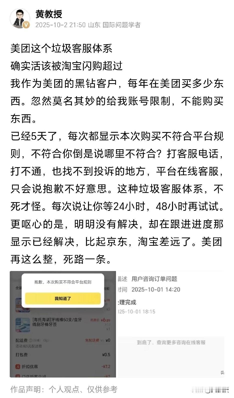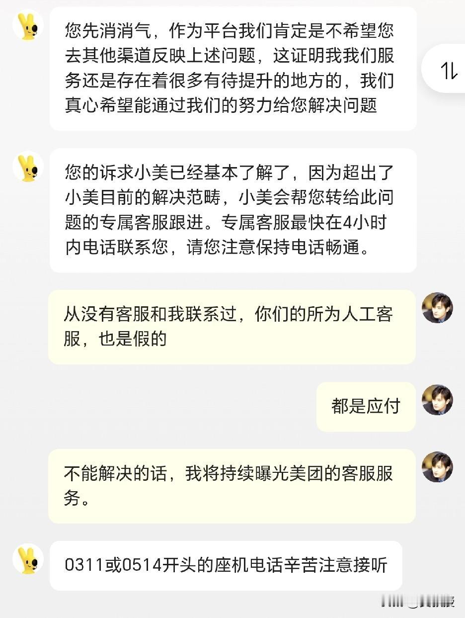 大家猜一猜,今天美团会给我打电话 解决问题吗? 五天来,美团的所谓专属客服 除了忽悠你,什么也没有做。每次都说会有人联系你解决,从未有人联系过,也没接到过任何电话。 如果美团作为一家超大平台,客服是这种垃圾像的话,确实不值得消费者信赖 五天了,买什么都是不符合平台规则,不符合你倒是说清楚哪里不符合?怎么解决,你也给个方案。作为美团长期用户的黑钻会员,就这种客服,实在是令人一言难尽。我就看美团给不给解决