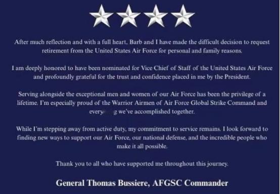 杯酒释兵权终于有效果了!特朗普跟赫格赛斯斩获了第1员美军大将! 美国将军大集会之后,美国空军全球打击司令部,总司令托马斯.布西埃将军宣布退役! 这位62岁的4星上将,在声明中并没有任何的埋怨。 他只是平静的说道,经过深思熟虑,我和妻子作出决定,因个人和家庭的原因,我决定从美国空军中退役。 这位老将自2022年12月起就肩负着指挥美国全部空基和陆基战略核打击力量的重任,其手中掌握的权力直接关系到美国的核威慑能力。 就在三个月前的7月,他还被特朗普提名为下一任空军副参谋长,这本该是其军事生涯再攀高峰的标志。 然而《航空周刊》9月初的报道却显示,他的提名突然被撤回,当时这一变动并未引起太多关注,直到将军大会后的主动退役,人们才意识到这背后或许隐藏着一场精心策划的权力洗牌。 所谓的“个人和家庭原因”,更像是一种心照不宣的托词。 熟悉美军体系的人都清楚,四星上将的退役程序复杂且严谨,通常需要提前数月甚至半年规划,而布西埃在将军大会后次日便迅速宣布退役,时间节点的巧合性很难用“巧合”来解释。 赫格赛斯在大会上的表态绝非空穴来风,这更像是一场公开的“站队测试”,而布西埃的退役,正是对这场测试的回应。 这种以“自愿”为名的权力清理,与历史上宋太祖赵匡胤“杯酒释兵权”有着异曲同工之妙,只不过现代政治语境下,少了几分酒桌上的温情脉脉,多了几分会议现场的直接施压。 要理解这场“杯酒释兵权”的深层逻辑,就必须将其置于特朗普政府对军方权力结构的重塑计划中来看。 早在2025年1月,新任国防部长赫格赛斯就曾下令剥夺美军前参谋长联席会议主席马克·米利的安保待遇,暂停其涉密许可,甚至打算将米利退役时的军衔从四星上将降为中将。 米利之所以成为打击目标,正是因为他在特朗普第一任期内多次因言行触怒后者,甚至被特朗普威胁应以“叛国罪”处以死刑。这一事件已经释放出明确信号:特朗普政府对军方内部“不听话”的高层将领采取零容忍态度。 而在军事指挥体系改革上,特朗普政府更是动作频频。3月1日,赫格塞思证实特朗普放宽了授权美国指挥官在常规战场之外进行空袭和特种作战突袭的限制,扩大了可打击目标的范围。 中央广播电视总台环球资讯广播《环球军事报道》主编魏东旭曾分析指出,特朗普此举意在削弱美国军方高层的权力,“越过军方高层,和一线作战的指挥官直接对接,向他们放权,让他们更多地执行来自白宫的决策和军事指令”。 这种“架空高层”的策略,必然会遭到传统军方体系的抵制,而布西埃作为掌握战略核力量的关键将领,其立场态度直接影响新政策的推行效果。 当赫格赛斯在将军大会上发出“不认同就离开”的最后通牒时,布西埃的退役实际上成为了特朗普政府权力意志的一次集中体现。 从美军的制度层面来看,布西埃的退役也打破了常规。按照美军惯例,四星上将的退役年龄通常在64岁左右,62岁的布西埃尚在服役年限之内,且其担任空军全球打击司令部司令期间并无明显过失记录。 相反,他所指挥的部队负责维护美国的战略核威慑能力,是美军“三位一体”核力量的重要组成部分,在当前国际安全形势复杂多变的背景下,这一职位的稳定性至关重要。突然更换指挥官,不仅可能影响核力量的战备状态,也会对军队内部的指挥链造成冲击。 但特朗普政府显然更看重权力的掌控,而非制度的延续性,这种“为达目的不择手段”的风格,在布西埃退役事件中展现得淋漓尽致。 值得注意的是,布西埃的退役并非孤立事件,而是特朗普政府重塑军方权力结构的一个缩影。 自2025年特朗普再次入主白宫以来,美军高层变动频繁,一系列政策调整都指向“强化白宫对军队的直接控制”。 赫格赛斯作为特朗普的亲信,在这场权力重组中扮演了“急先锋”的角色,从剥夺米利待遇到放宽空袭限制,再到将军大会上的公开施压,每一步都精准打击着传统军方势力的根基。 而布西埃的“主动”退役,无疑为其他将领树立了一个“榜样”——要么服从白宫的权力意志,要么选择离开。 当“杯酒释兵权”的戏码在现代美国上演时,我们看到的不仅是一位将军的退役,更是一个超级大国军队内部权力结构的深刻变革。 特朗普和赫格赛斯用一场将军大会和一次“自愿”退役,完成了对军方高层的又一次“清洗”,而这种以权力压倒制度的做法,终将给美军的长远发展埋下隐患。 在布西埃平静的声明背后,一场无声的权力地震已然发生,其后续影响恐怕还将在美军内部持续发酵。
