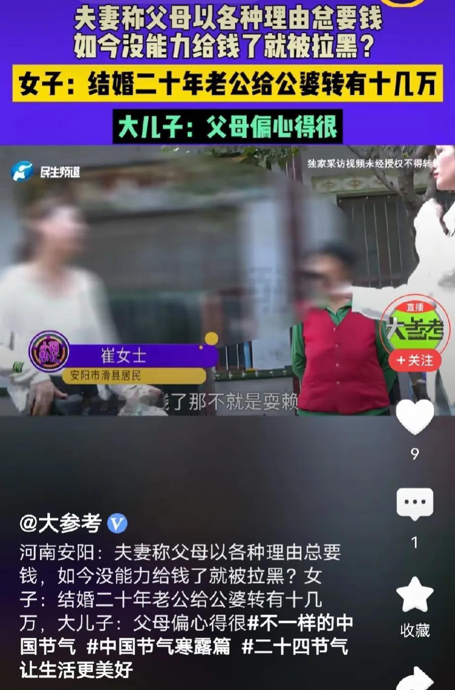 河南安阳,女子跟丈夫结婚后,公婆以各种理由问他们要钱,帮忙带孙子得付工资,女子老公生病了,婆婆来照顾得付工钱,小叔子结婚公婆借走58000元,有借没还,两人结婚十几年陆续给公婆转十几万,没想到,女子丈夫一生病,没法给钱了,夫妻俩直接被拉黑,更过分的是,两老把村里给的地钱也霸占了。女子气愤不已,找媒体曝光,希望公婆能还地钱,婆婆一番话,差点没把人气晕。 崔女士的老公是家里老大,他还有两个弟弟,两个弟弟年龄比他小挺多。 从小到大,父母一直就比较偏心两个弟弟,啥脏活累活都找崔女士的丈夫做。 此外,两老也经常教育崔女士丈夫,做大哥要有大哥样,照顾弟弟,帮衬家里。 崔女士的老公是一个很老实听话的人,对父母的话言听计从,成年后,打工得的每一分钱都交给母亲保管。 零几年,崔女士和丈夫结婚后,有了自己的小家,不跟公婆吃住了,但是两老依然想方设法从崔女士老公那里拿钱。 2005年崔女士生下儿子不久,为了补贴家用就出去打工了,她们夫妻俩协商让婆婆帮忙带娃。 婆婆提出,娃我可以帮你们带,但,得给我工资,一个月800元。 那时崔女士每个月的工资也才几百块,她觉得婆婆很不理解她们,但是孩子没人带,她没办法。 之后小叔子结婚,公婆又以家里没钱,做大哥的得帮帮忙,跟崔女士丈夫借58000元。 那时,崔女士夫妻俩只能勉强凑出38000元,公婆就让他们去借,借不到就去闹,各种道德绑架,直到钱到手。 崔女士丈夫没办法,硬着头皮跟同事、朋友借了2万给父母。 不久后,婆婆的小弟,崔女士丈夫的4舅因为资金紧张,跟崔女士丈夫借6000块钱,答应几个月后就还清。 没想到,崔女士一家左等右等,却不见四舅还钱,后来一问,他说已经还给崔女士婆婆了。 崔女士彻底看清公婆的嘴脸,她心里想着能远离尽量远离,但丈夫做不到,总背着她偷偷给父母钱。 有一次,公公住院,账单直接发给崔女士丈夫,要求他给钱,其实医保报销后只花1000多不到2000,但是他们跟崔女士丈夫说一共花了6000元。 崔女士丈夫担心父亲身体,他是一个大孝子,二话不说直接转6千。 按理父亲有3个儿子,他住院,理应三个儿子一起承担,但是两老从不问老二老三拿钱,一切由老大来买单。 崔女士丈夫想着毕竟是自己父母,不该计较那么多,何况自己有需要的时候,父母也搭把手了。 但,前几年发生的事,还是让崔女士和丈夫很寒心。 前几年,崔女士丈夫得了重度肺炎,他提出让母亲过来照顾他两个月,母亲一听立马问他要工钱,有工资才过去。 最后,崔女士丈夫转了8000块钱给母亲。 如今,崔女士丈夫摔伤了腿,走路得拿拐杖,心脏也出了问题,彻底干不了活了,他也不知道自己能活多久,没办法继续再给父母钱。 没想到,两老直接把崔女士夫妇俩拉黑,彻底不联系!,此外,连婆婆的娘家人几个舅舅也彻底不跟崔女士夫妇联系。 更过分的是2016年之前和2017年的地钱,一直打到婆婆账户上,婆婆一直没给他们。 崔女士觉得很寒心,自己嫁进这个家十几年,陆续给公婆转十几万块钱,但是最后他们却这么狠心。 崔女士找来记者,希望公婆把之前借他们的钱和地钱还给她们。 可婆婆却不承认,她说从未见过这些钱,而且自从崔女士嫁进来后,大儿子都不听她的话了。 崔女士听完,从包包里,拿出这几年给婆婆的银行转账记录,婆婆嚷嚷着,就是没见过这些钱。 记者提醒婆婆,儿媳妇有证据,确实给你转钱了,然后又问婆婆,地钱有没有打到你卡里,婆婆回答:一概不知。 那么,从法律角度如何看待这件事? 《民法典》第26条规定,父母对未成年子女负有抚养、教育和保护的义务。成年子女对父母负有赡养、扶助和保护的义务。 在本案中,崔女士的丈夫对其父母负有赡养义务,但这并不意味着公婆可以随意向崔女士夫妇索要钱财。 公婆以各种理由要求崔女士丈夫支付带孙工资、照顾生病的工钱等,超出了合理的赡养范围。 赡养义务主要是指在父母缺乏劳动能力或生活困难时,成年子女提供必要的物质帮助和生活照料,而不是通过各种名义索要额外的财物。 《民法典》第122条规定,因他人没有法律根据,取得不当利益,受损失的人有权请求其返还不当利益。 崔女士夫妇给公婆转了十几万块钱,其中部分钱可能是基于自愿赠与,但对于公婆借走的58000元以及霸占的地钱,公婆没有合法依据占有这些钱财,构成不当得利。 崔女士有银行转账记录等证据,能够证明这些钱的流向,她有权要求公婆返还这些不当得利。 对此,我想说,孝顺不等于无底线“提款”。 父母偏心、以带孙和照顾大儿子为由索要工资,把大儿子当唯一提款机,已超出合理赡养范畴。 借的与地钱按理应该返还,还好崔女士有转账记录,这是关键证据,建议尽快起诉。 同时,夫妻间要先统一立场,设定边界,必要时做财产公证,保护自身权益。 关注@猫眼学法 品读案例故事,学习法律经验