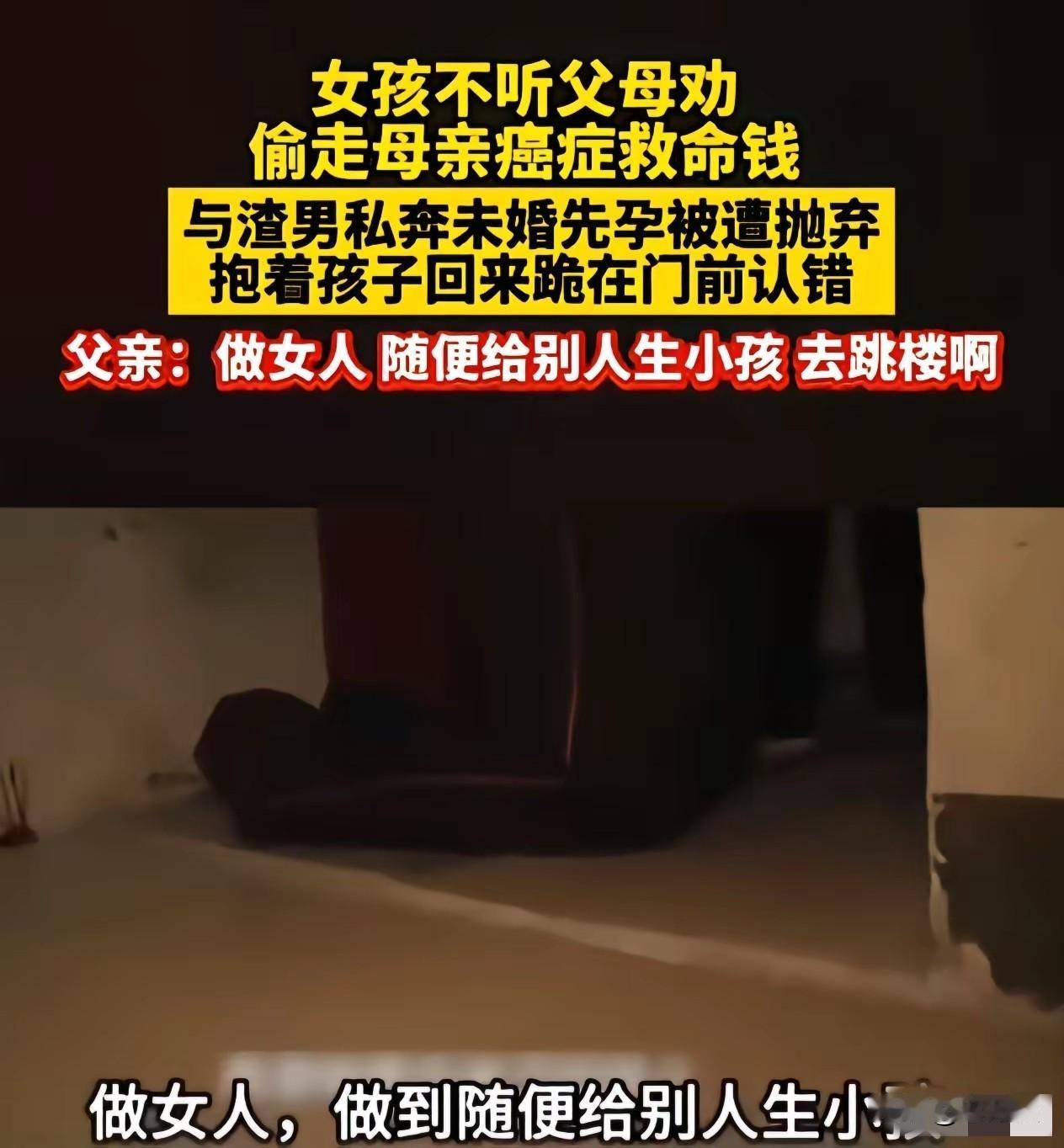 女孩子不顾家人的反对,跟男孩子私奔,并且把母亲救命的钱偷走,跟男子生下了小孩,但是生下小孩不久,母子俩就被渣男抛弃。为此,女子抱着自己的小孩来到跪在父母门口求原谅,父亲气不打一处来作为女人,随便跟别人生小孩怎么不去跳楼呢!父亲真的是恨铁不成钢,面对女儿如此的叛逆,父亲能怎么办呢?儿大不由娘,最让人气愤的是,女孩子不自爱,受害的就只能是自己。面对幼儿落母,以后的日子怎么过呢?面对这样的窘状,父亲除了责骂又能怎么样呢。如果自己生了这样的女儿,又能怎样去解决呢?又能怎样去面对呢?