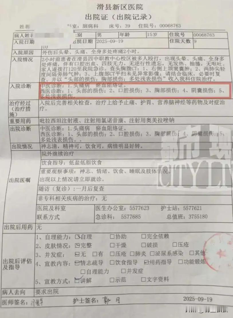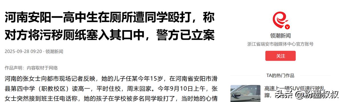 “太恶劣了!”河南安阳,一高中男孩因同学熄灯后说话打闹,影响他休息,便出言制止,谁知却遭到对方报复。对方找了十几个人对男孩进行殴打,甚至还将一团带着屎尿的厕纸塞到他嘴里!事后,男孩家长向施暴学生家长讨要说法,可对方却说是男生骂人在先,这不是校园暴力,被殴打才算校园暴力。 事情是 9 月 9 号晚上发生的。学校宿舍有规定,熄灯后不能关门,对门寝室的同学闹得特别凶,又是说话又是打闹,动静大得让男孩小任根本没法睡。 他翻来覆去忍了半天,实在熬不住了,才朝着对门喊了句 “都赶紧睡吧,不要吵了”,这话多正常啊,换谁被吵得睡不着,都会想让对方安静点,可没成想就这一句平常的请求,竟成了对方报复的理由。 转天对门那几个同学就找来了十多个人,趁没人注意,把小任拽到了厕所里,一进厕所这十几个人就围着他动手了,拳头巴掌往身上招呼,还把他按在地上不让他反抗。 更过分的是有人竟然从厕所隔间里捡了一团沾着污秽的厕纸,硬往小任嘴里塞 ,小任拼命挣扎可架不住对方人多力气大,最后还是被塞进了嘴里,那十几个人看着他难受的样子,非但没停手反而还在旁边起哄,直到揍了快十分钟,才骂骂咧咧地走了。 小任被打得浑身是伤,嘴里又脏又臭,委屈得不行赶紧联系了家长,家长赶到学校看到孩子的样子,心疼得直掉眼泪,赶紧带他去医院检查,光是身体上的淤青就好几十处,更别说心里受的惊吓了。 出院后小任像变了个人似的,白天总是坐着发呆,眼神愣愣的,到了晚上更是不敢睡,一闭眼就做噩梦,梦里全是被堵在厕所里的场景,经常哭喊着 “害怕” 惊醒,那团脏厕纸带来的羞辱,比身上的伤更难愈合。 小任的家长咽不下这口气,找到那些施暴学生的家长想讨个说法,让他们给孩子道歉,承担医药费和精神损失,可没成想有个刘姓家长竟说出了让人火大的话:“是你们家孩子先骂人,这不算校园暴力,只有被殴打才算!” 这话简直没道理到了极点,就算退一万步说,小任真在争执时说了不好听的话,那也不能成为十几个人围殴他、还用脏厕纸塞他嘴的理由啊!这分明是在为自家孩子的恶行找借口,把黑的说成白的,一点都没意识到孩子做错了什么。 更让人失望的是学校的处理。这么恶性的事件,涉及十几个人,学校最后只对三个带头的学生做了停课处理,其他参与的人几乎没受什么惩罚。 小任的家长想找校方负责人进一步沟通,对方却一直避而不见,连句像样的解释都没有,这种敷衍的态度,根本不是在解决问题,反而像是在纵容这种恶劣的行为。 其实谁都知道“未成年” 不是作恶的挡箭牌。《民法典》里写得明明白白,未成年人犯了错,监护人必须承担赔偿责任,不管是医疗费还是精神损害抚慰金,都得赔。 学校作为管理方,没看好学生没保障好学生的安全,也逃不了责任,而且《治安管理处罚法》也有规定,就算因为年纪小不拘留,处罚记录也会进档案,跟着他们一辈子,以后升学、找工作都会受影响,真以为闹完就没事了?法律可不会惯着这种恶行。 现在想想这事儿最让人寒心的,不只是孩子们的暴力行为,更是施暴家长那种扭曲的逻辑,好像只要找到一点 “对方的错”,自家孩子再过分的行为都能被原谅。 可他们忘了教育孩子首先要教的是 “对错”,是尊重别人,而不是为恶行找借口,小任的遭遇不是个例,要是这种逻辑不被纠正,学校和家庭再不重视,还会有更多孩子受伤害,真希望能好好管管这种事,让每个孩子在学校里都能安安全全的,不用害怕因为一句 “请安静”,就遭遇这样的噩梦。 (信息来源:领潮新闻——河南安阳一高中生在厕所遭同学殴打,称对方将污秽厕纸塞入其口中,警方已立案)