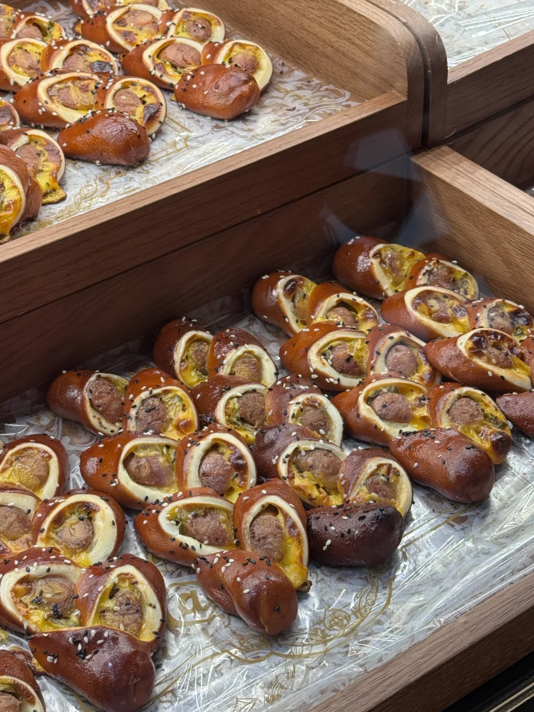 必冲的核桃马里奥果然名不虚传!表面核桃碎堆得厚实,咬下去先脆后软,奶油流心细腻不齁甜,面包体软韧得能拉丝,加热后香气直接翻倍。火焰榴莲面包是榴莲控福音,掰开全是实打实的鲜榴莲果肉,口感绵密,不是那种香精味,一口就沦陷。
