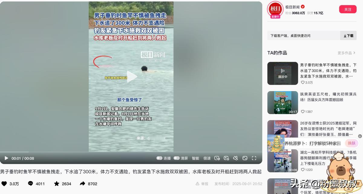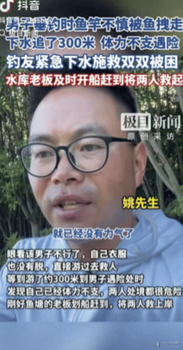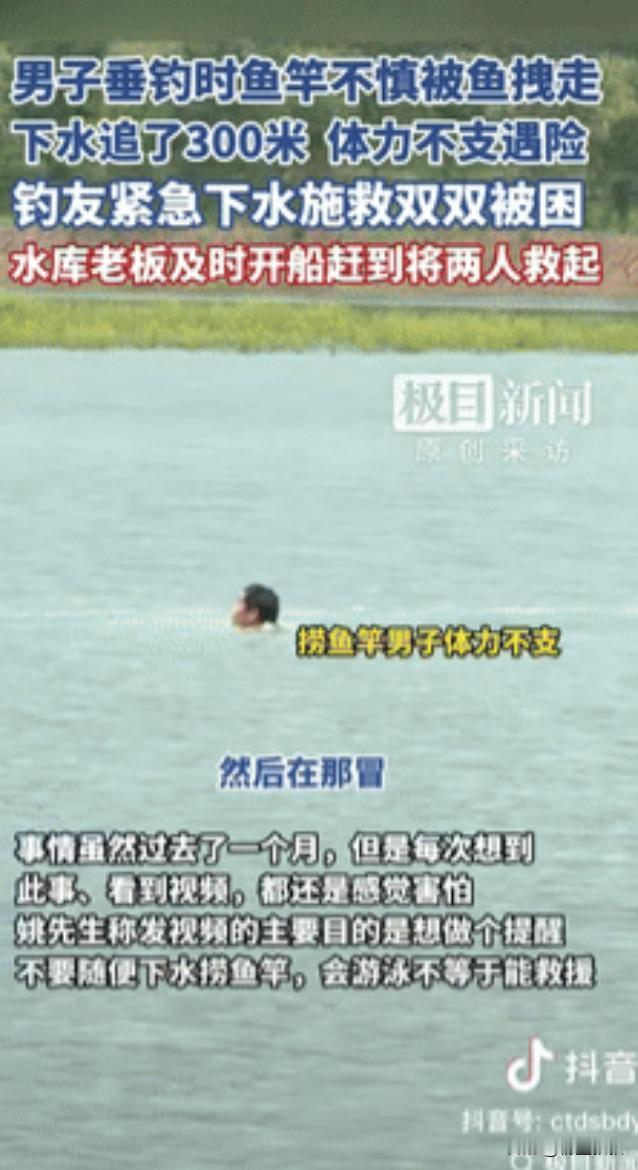 “这下后悔了吧!”据极目新闻9月1日报道,安徽合肥,一男子垂钓时,鱼竿不慎被鱼拽走,男子下水追了几百米,因体力不支落入险境,岸上钓友发现后,急忙下水救人,不料,两人双双被困,恰好鱼塘老板及时开船赶到,将两人救上岸,网友:是个狠人,要鱼不要命! 那天估计天气也不错,不然也不会有人去钓鱼,有个男的正钓着,突然鱼咬钩了,看那力道估摸着是条大鱼,可没等他高兴几秒麻烦来了,鱼劲儿太大,直接把他手里的鱼竿给拽跑了,顺着水面往水塘中间飘。 这鱼竿不是便宜货,听说是进口的,值好几千块,换咱们普通人,可能先愣一下,再喊喊旁边钓友帮忙想想办法,或者看看能不能用抄网够着,可这位倒好脑子一热,脱了鞋就往水里跳,一门心思要把鱼竿追回来。 旁边人估计都看傻了,喊他 “别去!水太深!” 他也听不进去,水里跟岸上可不一样,看着平静,底下说不定有草缠脚,而且水温比空气低,游一会儿就容易没力气。 他一开始游得挺急,眼睛盯着飘远的鱼竿,可追出去大概几百米,就明显不对劲了,胳膊划水的劲儿越来越小,腿也开始发沉,整个人在水里漂着,只能勉强抬头喊 “救命”。 那时候他心里肯定慌了,几千块的鱼竿早忘到脑后了,满脑子都是 “完了我游不回去了”,这时候再想 “早知道不追了”,可不就是 “这下后悔了吧!” 更揪心的是旁边有个姓姚的钓友,听见呼救声连衣服都没脱,也跟着跳下水救人,姚师傅肯定是好心,看人家快不行了,哪还顾得上想别的,就想着赶紧把人拉回来。 他自己会游泳,平时在泳池里游个几百米也没问题,可水塘里的情况太复杂了,衣服泡水后变得沉甸甸的,裹在身上又闷又沉,加上他一门心思往呼救的地方游,没一会儿也没力气了。 最后变成俩人在水里互相拽着,都动弹不得,只能一起喊救命,险情一下子就翻倍了,姚师傅那时候估计也后悔了,心里琢磨 “我咋就这么冒失?会游泳也不代表能救人啊”,要是因为救人把自己搭进去,家里人该多担心。 万幸的是鱼塘老板听见了俩人的呼救声,赶紧开着自己的小渔船往这边赶,老板常年在水塘边对水情熟,船开得又稳又快,没一会儿就到了俩人跟前,伸手把他们一个个拉上船。 俩人上船的时候,浑身湿透,嘴唇都有点发白,坐在船板上半天缓不过来,估计连说话的力气都没有了,后来这事儿被发到网上,网友们都评论说 “是个狠人,要鱼不要命”,其实哪是要鱼,是一开始舍不得那根贵鱼竿,可真到了水里才明白,鱼竿再贵能有命值钱吗?要是鱼塘老板没及时赶到,后果不堪设想。 这俩人被救上来之后,肯定都在心里骂自己当时太冲动,尤其是那个追鱼竿的男的,以后再钓鱼看见鱼竿飘走,指定不会再跳下去了,毕竟 “这下后悔了吧!” 的滋味,尝一次就够了。 (信息来源:极目新闻——男子垂钓时鱼竿不慎被鱼拽走,下水追了300米,体力不支遇险,钓友紧急下水施救双双被困,水库老板及时开船赶到将两人救起)