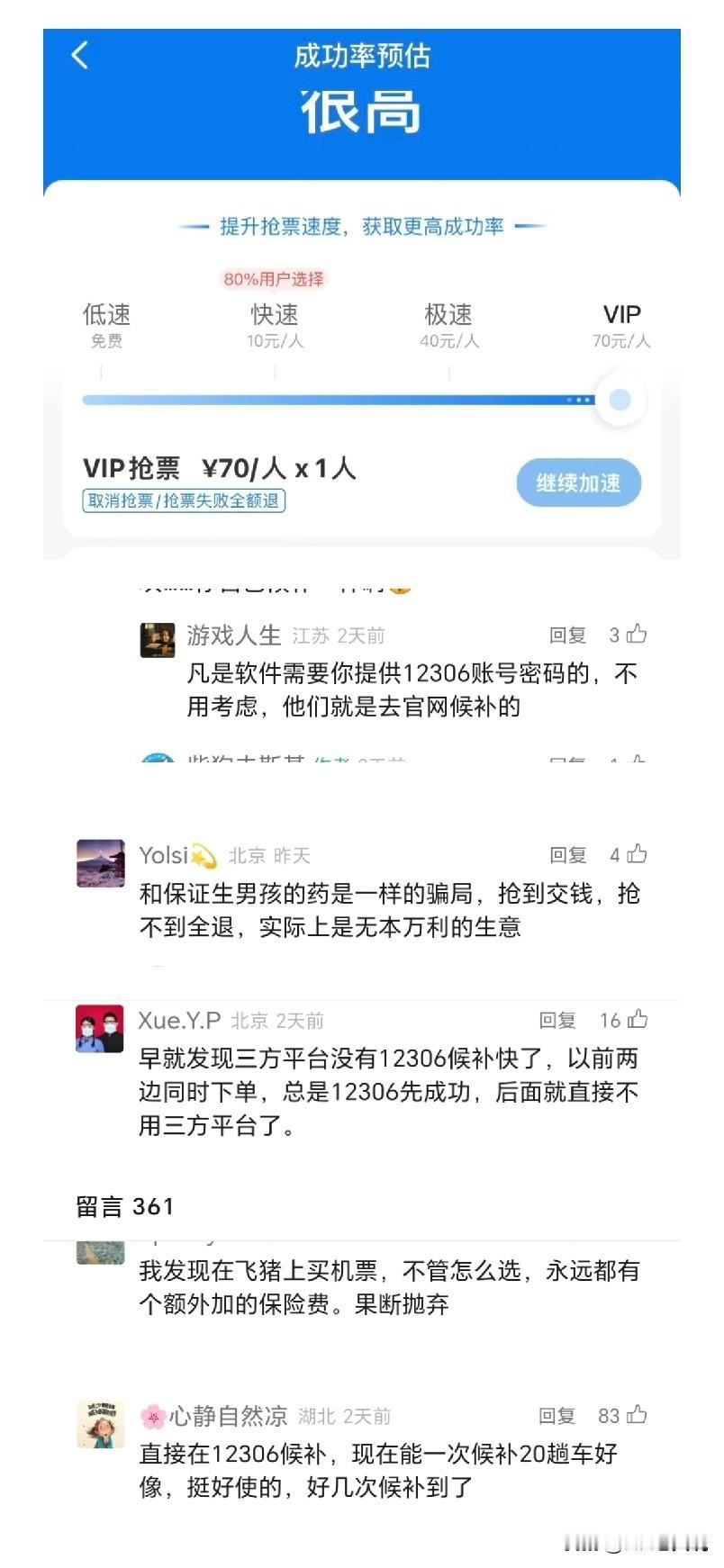 老家在哈尔滨的同事感慨说买个回家的火车票太难了,一下狠心多花了70块钱买了个加速包[捂脸]结果却被同事泼冷水:买火车票用加速包可以帮助抢票?官方都正式发声了:纯属骗人的噱头! 买加速包的同事自然不信,说自己多花了好几十, 明确写着”专人抢票、独享抢票通道"的!同事怎说你没看消保委做过实测,在9家购票平台购票,12306出票是最快的!另外8家号称提供有“加速包”服务的平台,都没有12306的抢票成功率和出票速度快!其中一家加了40块钱加速包的平台,比12306慢了将近一天一宿;另外一家加了48块钱的平台,比12306慢8小时! 而且这些所谓加价购买服务包的平台,还都存在搭售的情形!比如有的平台,稍不注意,就给你来个30块钱的保险费[捂脸] 所以关于加速包没用,12306官方也是经常发布声明,没有授权过任何第三方,加速没有用!就比如去年某平台为了吸引客流,打出了“全网免费退”的标语!结果12306直接回应:纯属营销炒作,误导消费者!