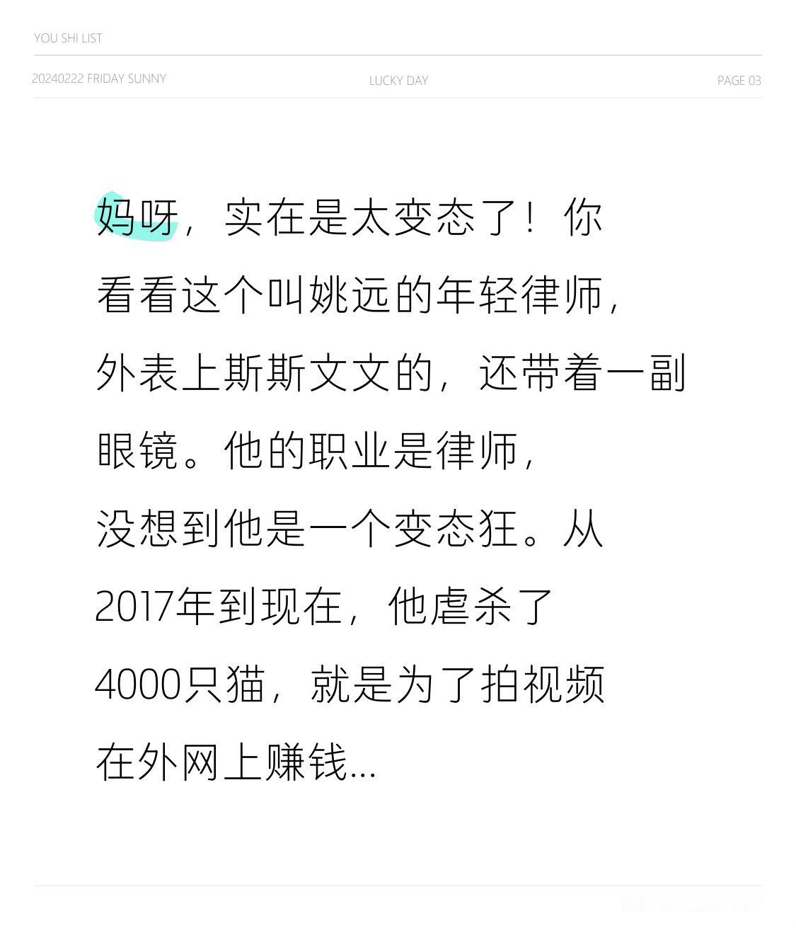 妈呀,这也太变态了! 你瞧瞧这个叫姚远的年轻律师,外表斯斯文文,还戴着一副眼镜。 他身为律师,谁能想到竟是个变态狂。从2017年至今,他虐杀了4000只猫,只为拍视频到外网上赚钱! 何其残忍啊! 就为了他那变态的癖好,那些可怜的小生命全在他手中惨遭虐杀! 国庆节前夕,他被上海的律师事务所开除了,这种人就该永不录用! 九零后律师 抚远律师 姚律师