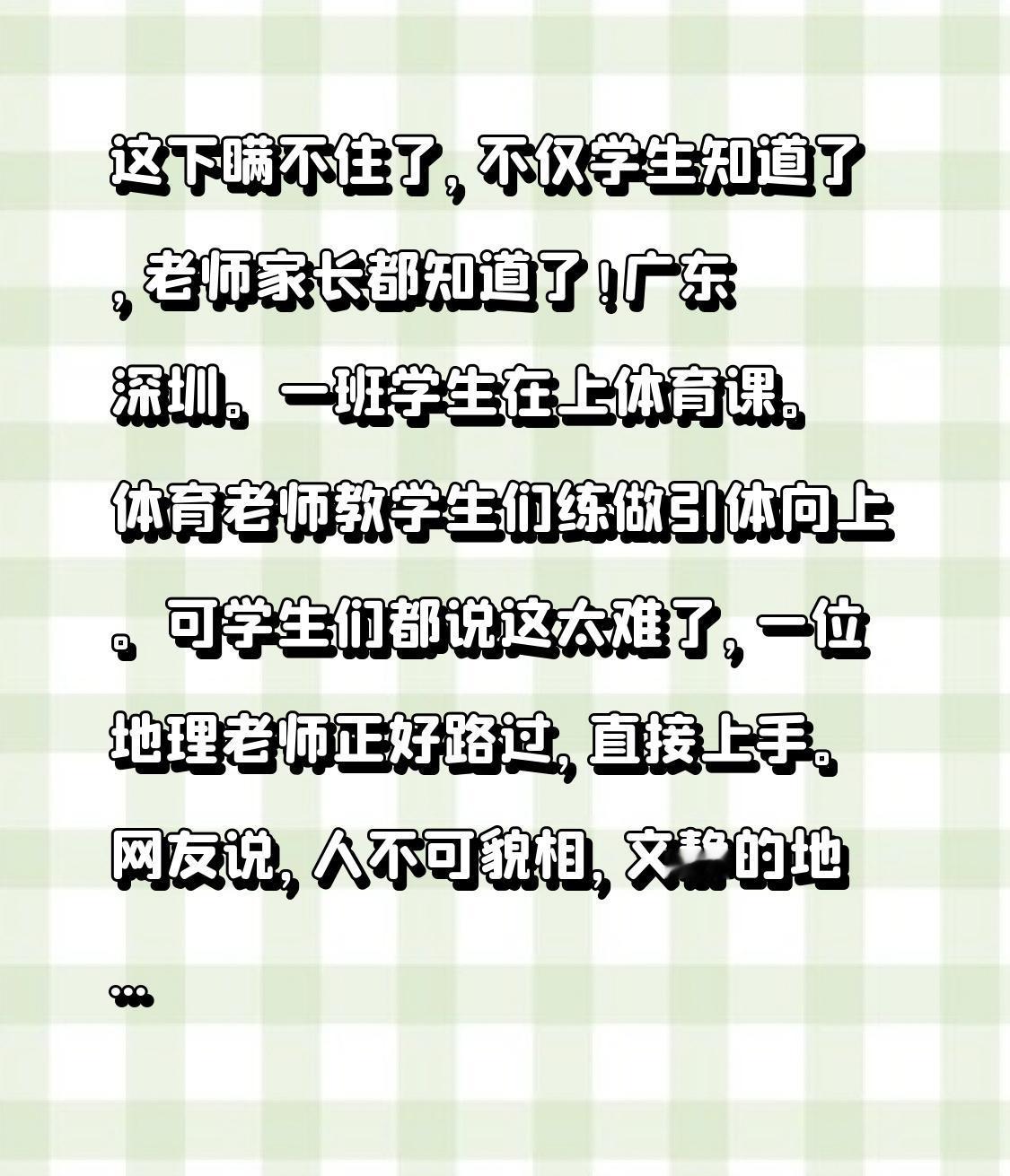 这下可瞒不住了,不光学生知道了,老师和家长也都知道啦! 广东深圳,有一班学生正在上体育课。体育老师指导学生们练习引体向上,可学生们纷纷叫嚷着太难。这时,一位地理老师恰好路过,直接上前示范。网友不禁感叹:人不可貌相,看似文静的地理老师竟有如此好的体魄! 这位地理女老师轻轻松松就完成了十个引体向上,这显然与她平时坚持锻炼密不可分。 引体向上能锻炼心肺功能、手臂力量和背部力量,若不锻炼,想多做几个引体向上可太难了。此次地理老师的现场展示,给那些喊难的学生们好好上了一课。 眼见为实才最有说服力,地理老师亲自示范,身教胜过言教,学生们自然心服口服。 大家说,是不是这个道理? 阶梯引体向上 迎体向上的好处 深圳高中体育生