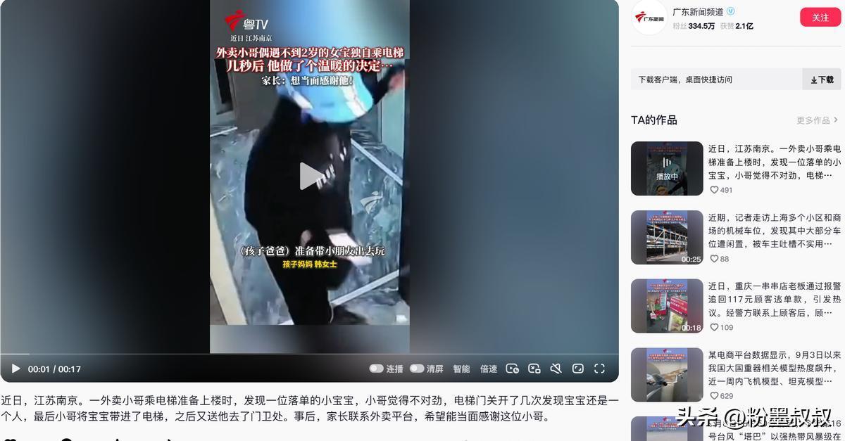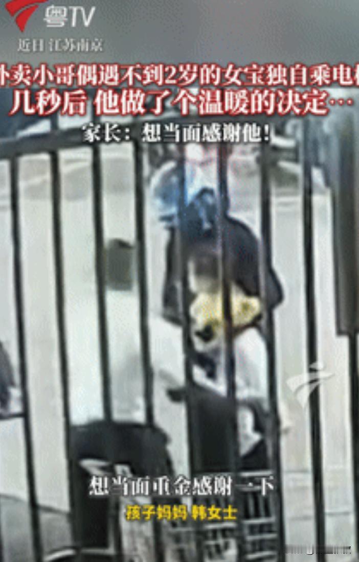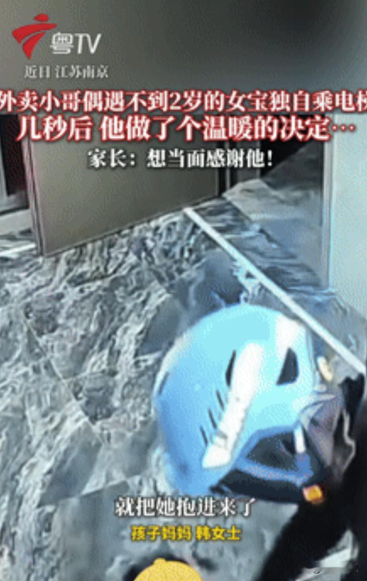 这才是正能量!9月8日江苏南京一外卖小哥坐电梯准备上楼时,发现一位落单的小宝宝,小哥觉得不对劲,电梯门关开了几次后,看到宝宝还是一个人,下一秒,他做了个温暖的决定...网友:所以说没有人贩子,孩子肯定丢不了! 那天小哥应该跟平时一样忙,手里攥着订单心里算着时间,生怕晚了耽误顾客用餐,他走进公寓楼的电梯,按了要去的楼层,等着电梯门慢慢关上。 可就在门快要合上的瞬间,又 “叮” 一声弹开了,门口站着个小小的身影,是个还够不着电梯按钮的小宝宝,一个人孤零零地站在那儿,眼神里带着点茫然,看那样子也就一两岁连话都说不利索。 小哥一开始也没多想,毕竟手上还有好几个订单等着,心里急着送完,可电梯门关上又打开的瞬间,他心里突然 “咯噔” 一下,这么小的孩子,怎么会自己一个人在电梯口? 谁家家长能这么不小心?他盯着孩子看了两眼,又探头往楼道里扫了扫,没看见有大人跟着,电梯门慢慢合上,小哥的心思却不在订单上了,满脑子都是那个孩子的样子,没等电梯升几层,他干脆按了 “开门” 键,又回到了一楼。 这次他没急着走,而是蹲下来跟孩子搭话,可孩子太小只会咿咿呀呀地说几句,说不出家里在哪层,也说不出爸妈的名字,小哥索性守在电梯口,来来回回观察了好几次,一会儿看看孩子是不是在等大人,一会儿往小区楼道口望,确认没有家长急急忙忙找过来。 这一耽误就是五六分钟,对送外卖的人来说,这几分钟可能就意味着订单超时,甚至要被扣钱,可他愣是没挪步,心里就一个念头,不能把孩子一个人扔在这儿。 后来他做了个特别温暖的决定,先不送单了先把孩子送到小区门卫室,他小心翼翼地牵着孩子的手,慢慢往门卫那儿走,路上还时不时跟孩子说两句话怕孩子害怕。 到了门卫室,他跟保安师傅仔细说了情况,还特意留下自己的电话,说要是家长找过来,有啥不清楚的可以联系他,安排好这些他才匆匆忙忙去送剩下的订单,手里的餐盒好像比刚才更沉了点,不过心里踏实多了。 更让人感动的是,过了一个多小时,小哥接了新订单,刚好又要去这个小区,他送完订单没立刻走,特意绕到门卫室,探头问保安师傅:“刚才那个孩子,家长来接走了吗?” 直到保安笑着说 “早就接走了,家长还说要谢谢你呢”,他才松了口气,点点头又匆匆赶往下一个订单点,你说这哪是一时兴起的帮忙?要是只为了图个心安,送完孩子就完事儿了,可他还特地回头确认,这份惦记才是真的走心。 后来这被发到网上,大家才知道这位外卖小哥根本不是专职送外卖的,他的主业是芯片研发工程师,听着就特别 “高精尖”,每天跟精密的仪器、复杂的代码打交道,却能在兼职送外卖的路上,对一个陌生孩子的安危这么上心。 这反差一下子就让人明白,善良跟职业真没啥关系,不管是搞研发的工程师,还是穿梭在街头的外卖员,心里装着别人,就会做出温暖的事儿。 网友们看完都评论说 “所以说没有人贩子,孩子肯定丢不了!” 这话其实说的是,只要身边多几个像小哥这样愿意多留意、多搭把手的人,孩子的安全就多一层保障。 小区里的监控能拍到处境,却给不了孩子安全感,物业的管理能维持秩序,却代替不了人与人之间的那点热乎气,可小哥这一个多留意、一次回头确认,就把这份热乎气传递出去了。 (信息来源:广东新闻频道——近日,江苏南京。一外卖小哥乘电梯准备上楼时,发现一位落单的小宝宝,小哥觉得不对劲,电梯门关开了几次发现宝宝还是一个人,最后小哥将宝宝带进了电梯, 之后又送他去了门卫处。事后,家长联系外卖平台,希望能当面感谢这位小哥。)